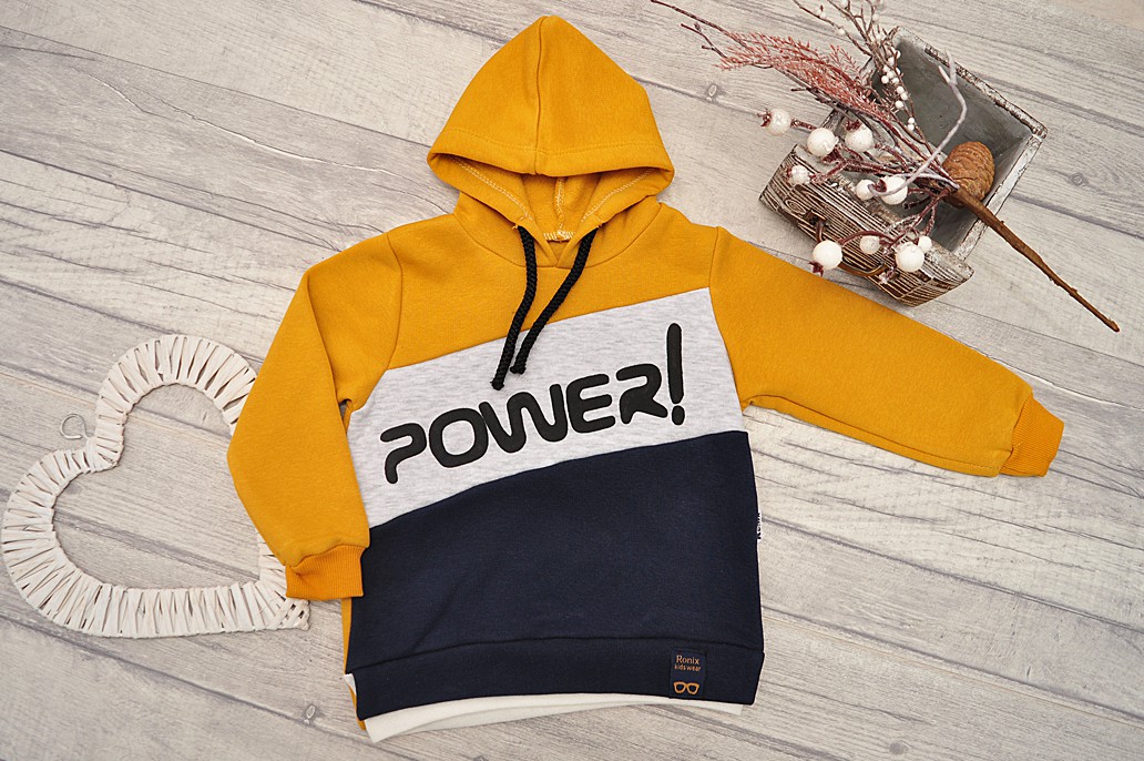 Bluza dresowa wkładana przez głowę. Bluza posiada kaptur z ozdobnymi czarnymi troczkami bez możliwości regulacji obwodu. Z przodu dwie wstawki, granatowa oraz szara z napisem POWER. Dół bluzy wykończony ozdobnym ściągaczem oraz białą wstawką symulującą wystającą spod bluzy koszulkę. Spodenki w kolorze granatowym z musztardowymi lampasami posiadają elastyczną gumkę w pasie. Nogawki spodenek wykończone ściągaczem.