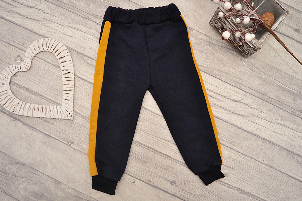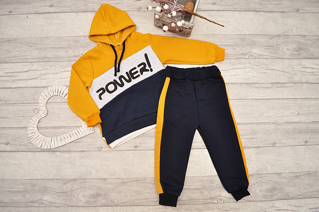 Dres chłopięcy 2-częściowy w skład którego wchodzą: granatowe spodnie oraz musztardowa bluza z kapturem.