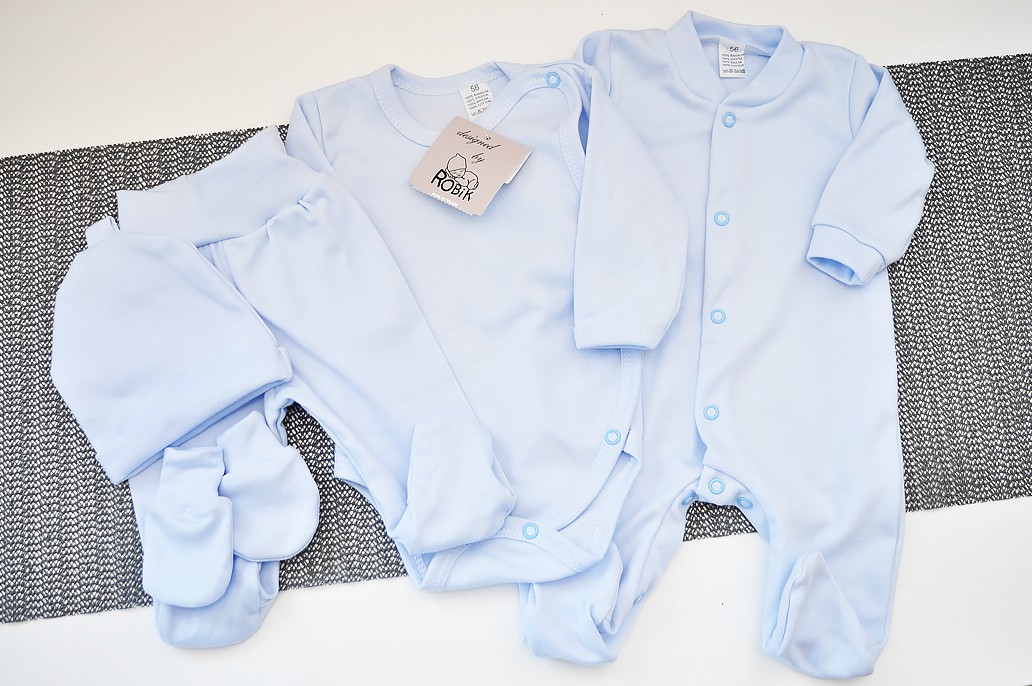 Niezbędna do szpitala niebieska wyprawka dla niemowlaka 5 - częściowa z polskiej bawełny. W skład kompletu wchodzą: