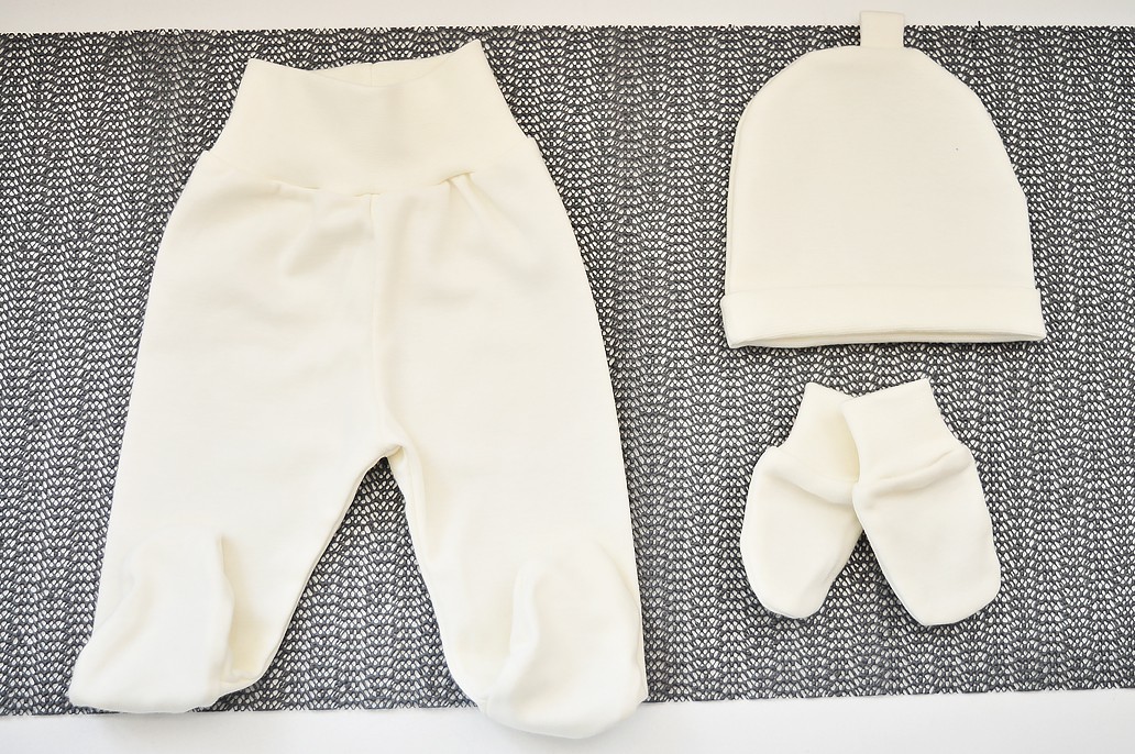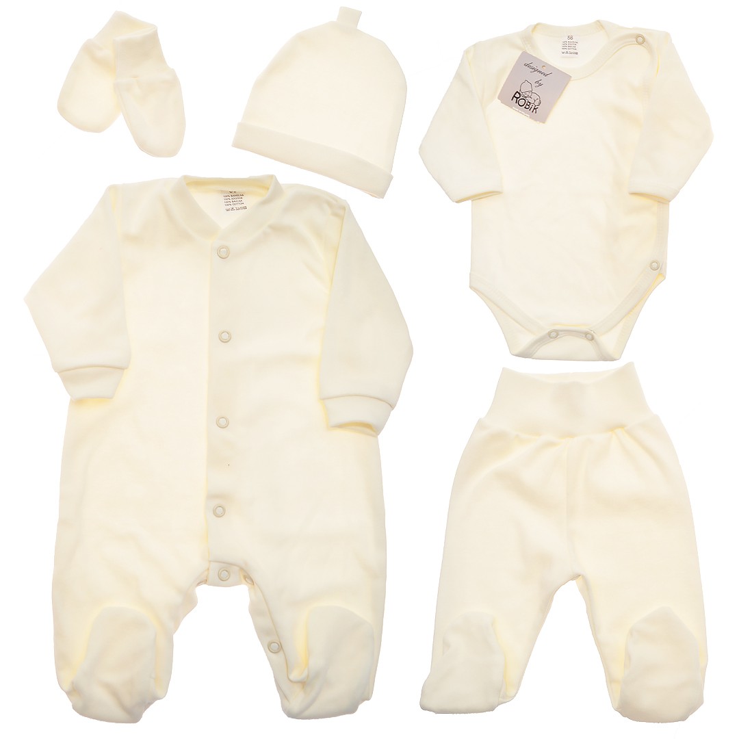 Ecru komplet niemowlęcy 5-częściowy - pajac, body kopertowe, półśpiochy, czapeczka, łapki.