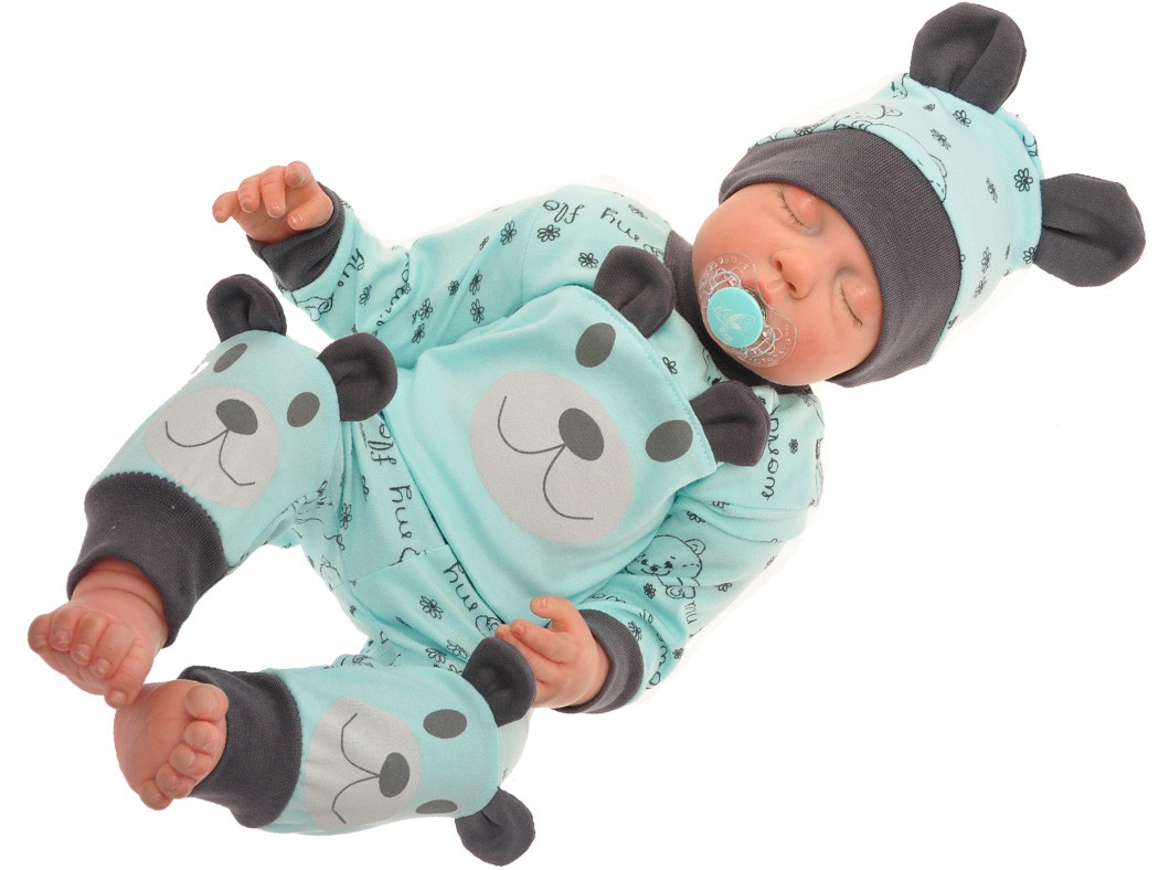Dostępne w zestawie niemowlęcym spodenki zamiast gumki posiadają w pasie bezuciskowy ściągacz a na nogawkach spodenek zostały nadrukowane buzie misia z trójwymiarowymi, grafitowymi uszkami.