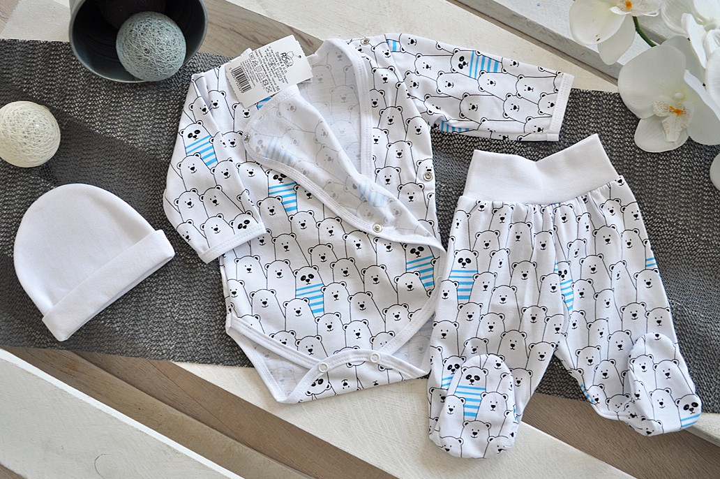 Niezbędna do szpitala wyprawka dla wcześniaka w misie 3 - częściowa z polskiej bawełny. W skład kompletu wchodzą: