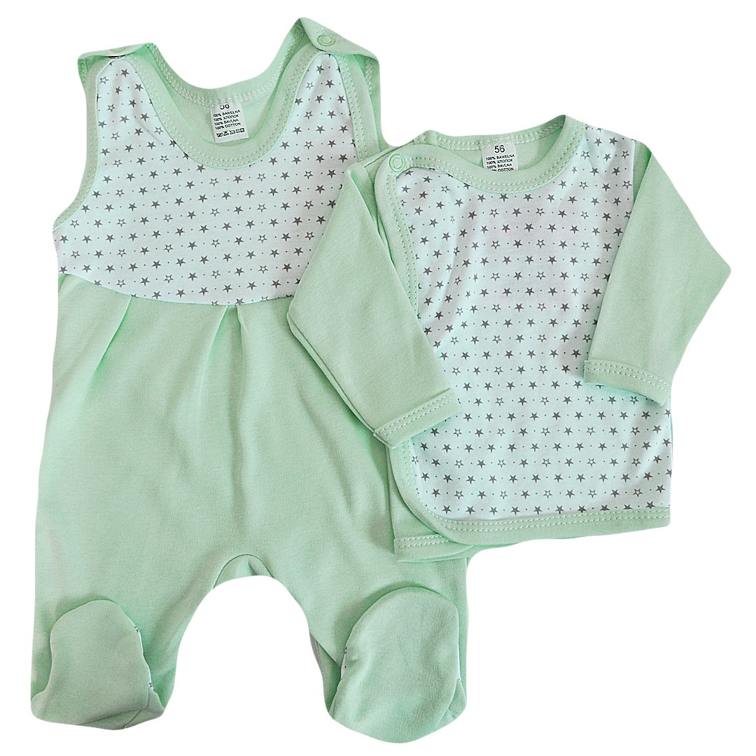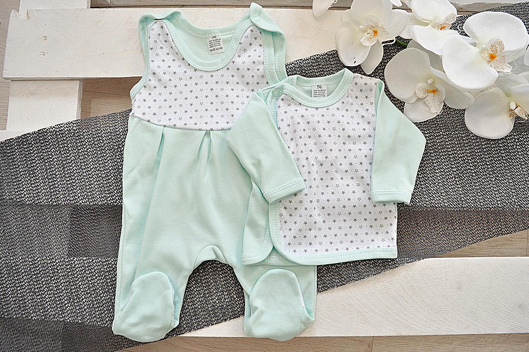 Miętowo-biały komplet dla wcześniaka 2-częściowy w szare gwiazdki - śpiochy plus koszulka kopertowa.