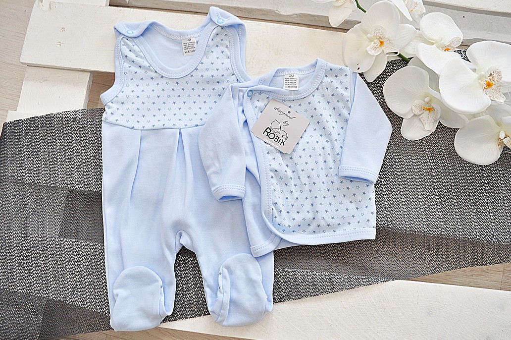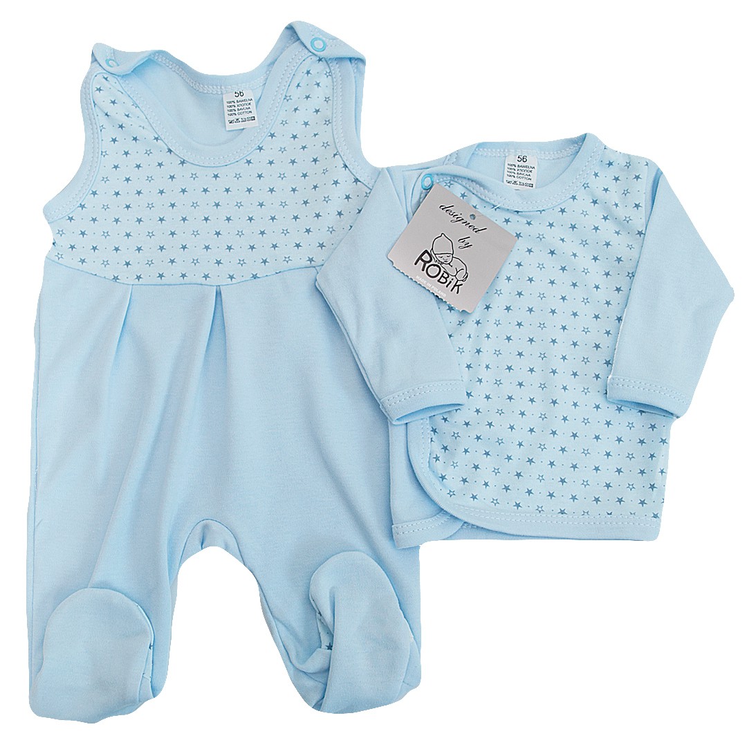 Niebieski komplet dla wcześniaka 2-częściowy z nadrukiem w gwiazdki - śpiochy plus koszulka kopertowa.