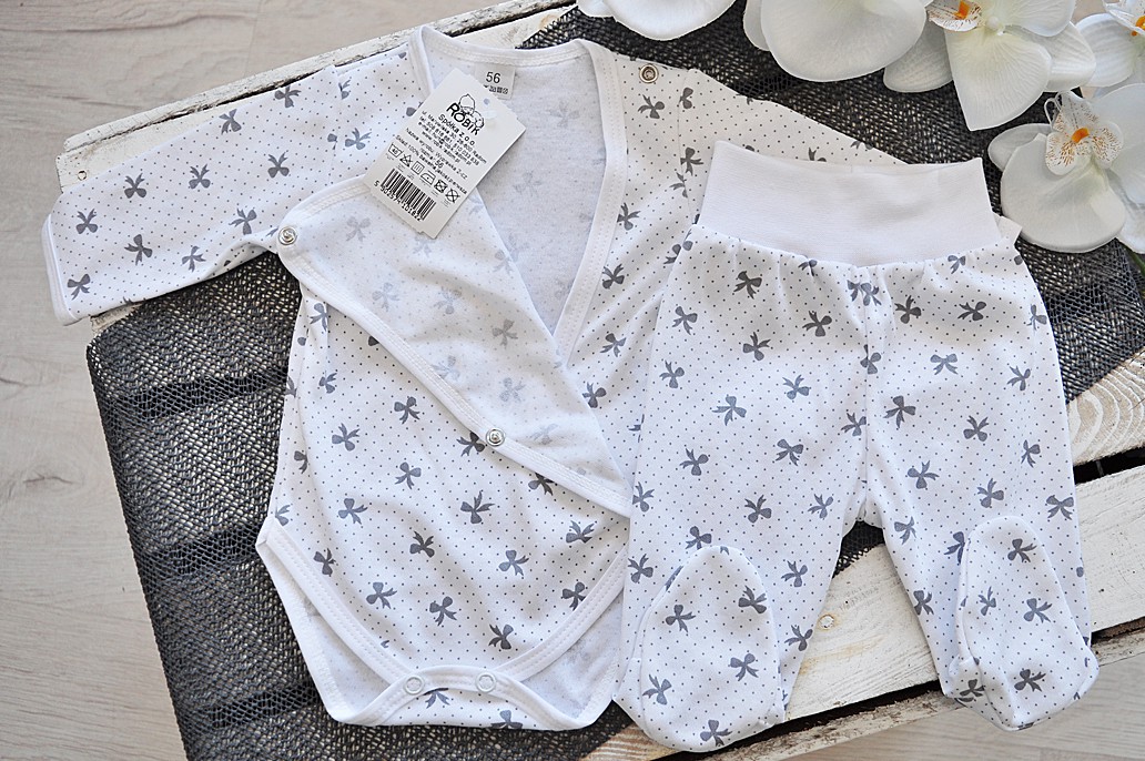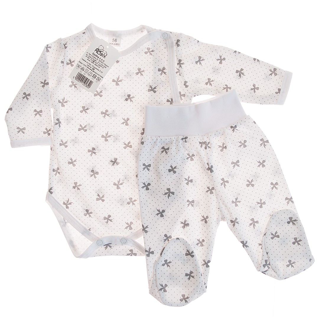 Ecru komplet dla niemowlaka 2-częściowy w szare kokardki - body kopertowe, półśpiochy.