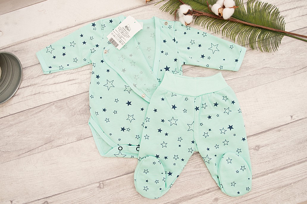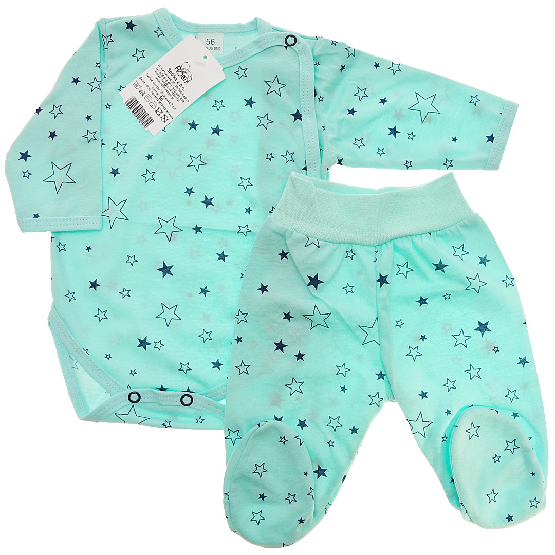 Miętowy komplet dla niemowlaka 2-częściowy w szare gwiazdki - body kopertowe, półśpiochy.