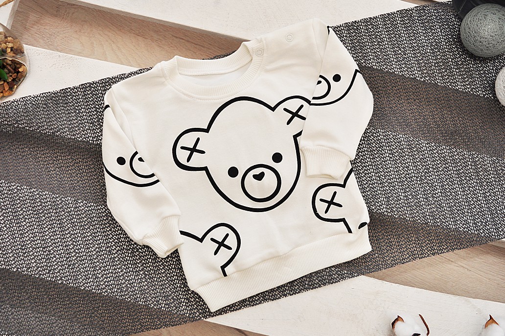 Bluzeczka z długim rękawem w kolorze ecru z nadrukiem głowy misia zarówno z przodu jak i na rękawach. Dół, dekolt oraz rękawy bluzy wykończone delikatnym ściągaczem. Bluzka dla niemowlaka zapinana na ramieniu na dwie napki.