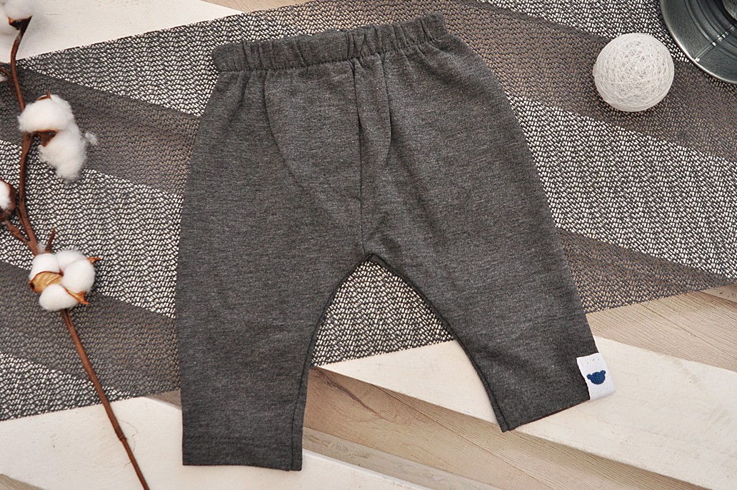 Szare spodenki dresowe posiadają elastyczną gumkę w pasie a dół jednej nogawki został przyozdobiony białym emblematem z głową misia.