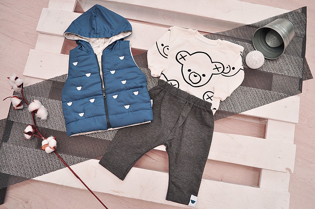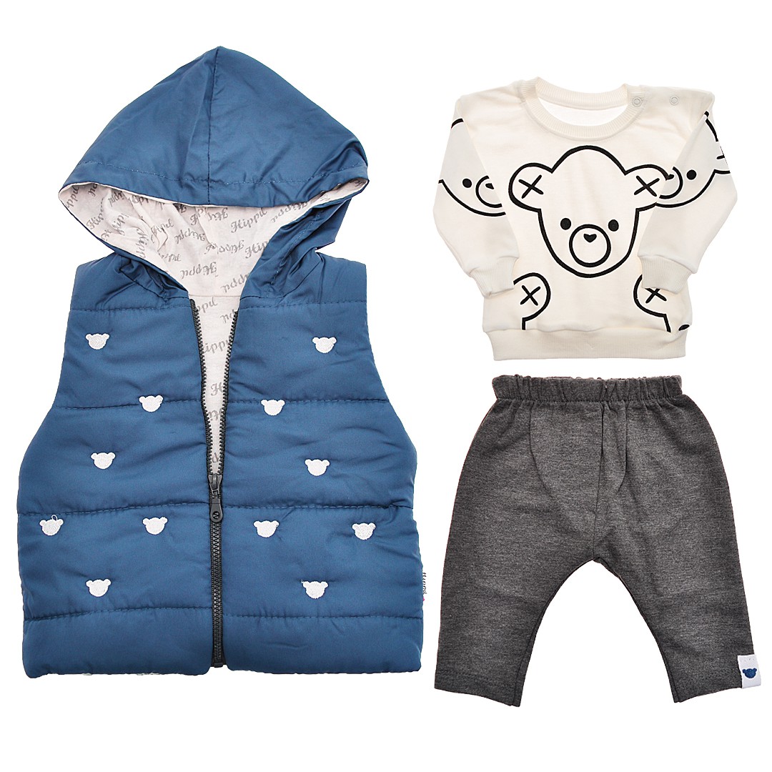 Komplet 3-częściowy w skład którego wchodzą: ciemno niebieski bezrękawnik, szare spodnie oraz ecru bluzeczka z nadrukiem.