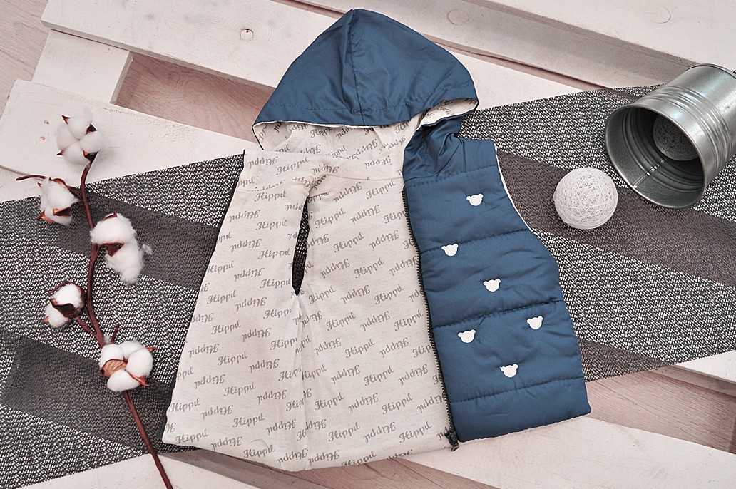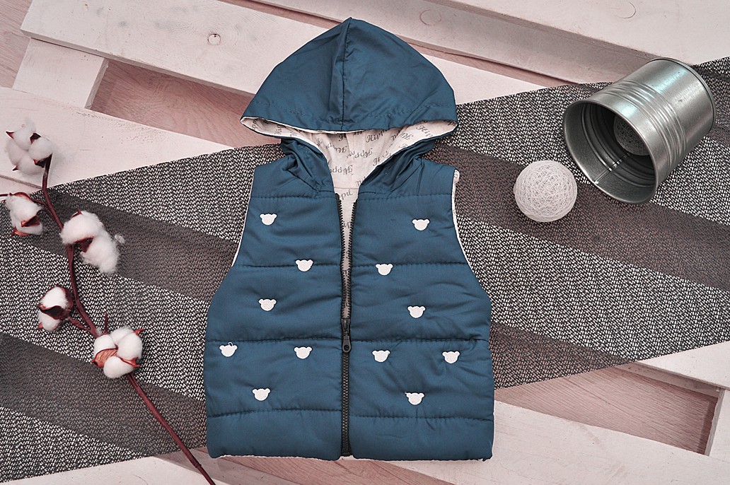 Niebieski bezrękawnik z kapturem z białymi aplikacjami w kształcie głowy misia. Kamizelka zapinana przez całą długość na suwak podszyta od wewnątrz białą podszewką z nadrukiem. Kaptur tego bezrękawnika niemowlęcego również został podszyty białą podszewką z nadrukiem.