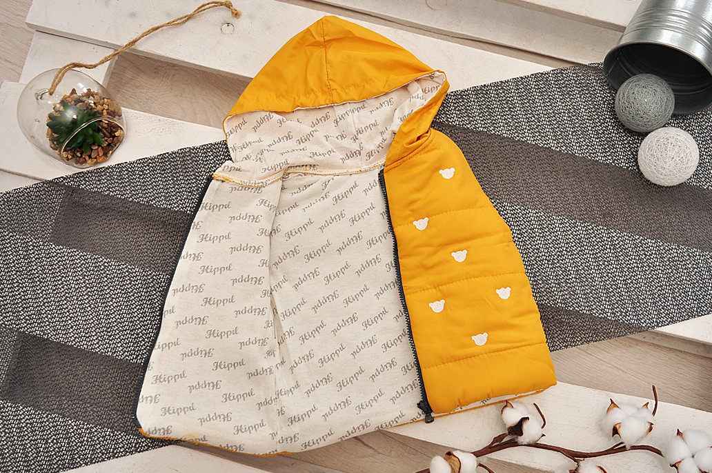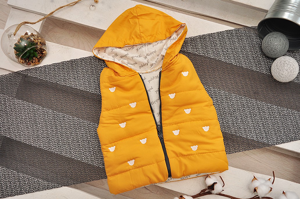 Musztardowy bezrękawnik z kapturem z białymi aplikacjami w kształcie głowy misia. Kamizelka zapinana przez całą długość na suwak podszyta od wewnątrz białą podszewką z nadrukiem. Kaptur tego bezrękawnika niemowlęcego również został podszyty białą podszewką z nadrukiem.