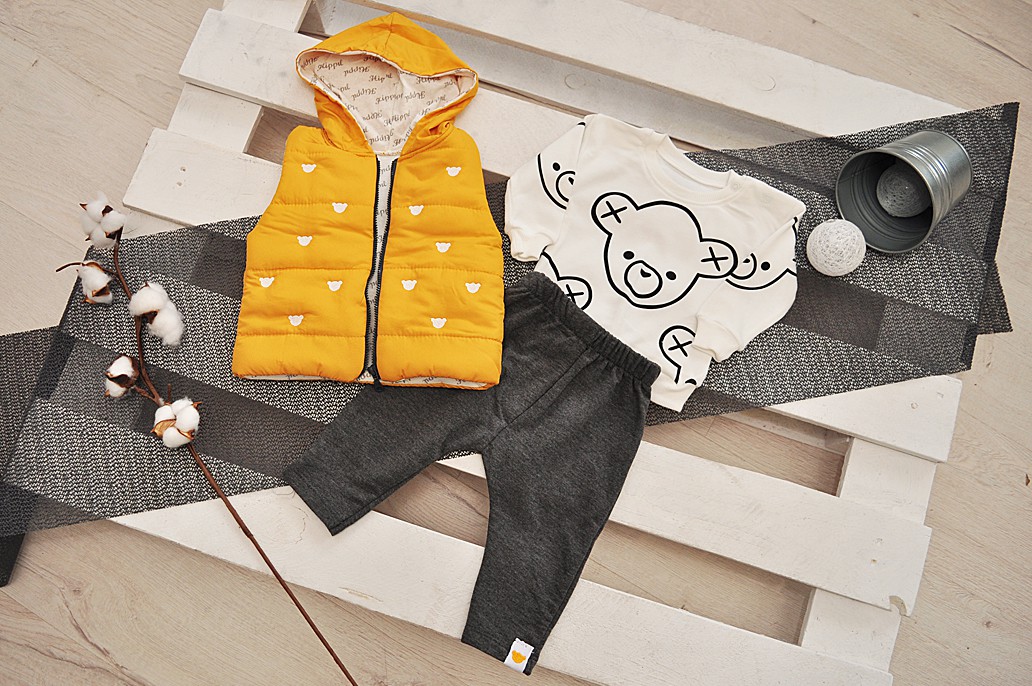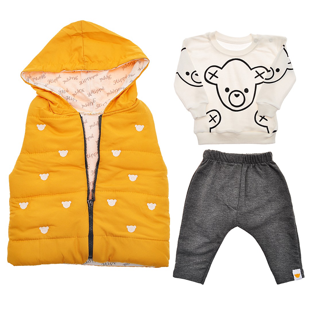 Komplet 3-częściowy w skład którego wchodzą: musztardowy bezrękawnik, szare spodnie oraz ecru bluzeczka z nadrukiem.