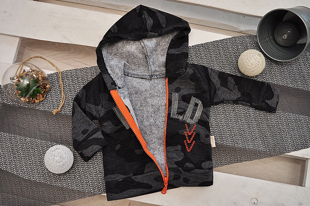 Grafitowa moro bluza dresowa z kapturem zasuwana przez całą długość na suwak z wyszytym białym napisem WILD oraz pomarańczowymi strzałkami. Rękawy oraz dół bluzy zakończone są ściągaczem.