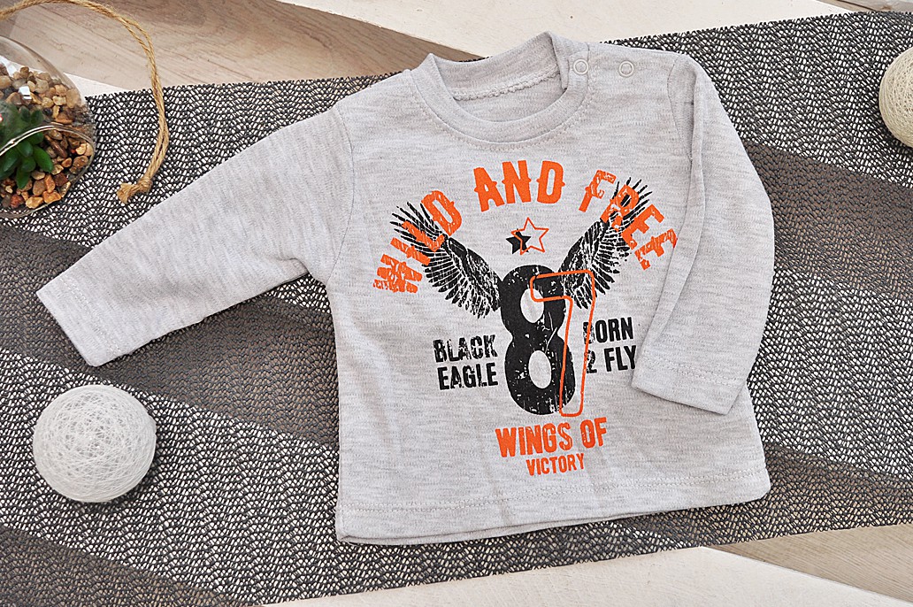 Bluzeczka z długim rękawem w kolorze szarym z pomarańczowo-czarnym nadrukiem WILD AND FIRE. Bluzka dla niemowlaka zapinana na ramieniu na dwie napki.