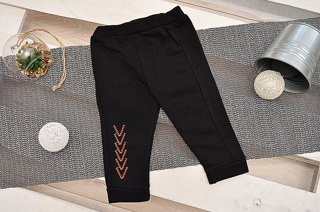 Czarne spodenki wykończone ściągaczem posiadają elastyczną gumkę w pasie oraz wyszyte pomarańczowe strzałki na lewej nogawce.