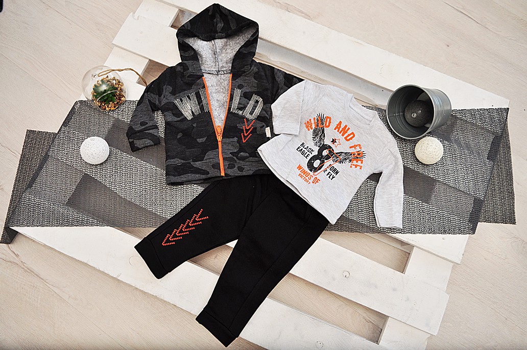 Dres niemowlęcy 3-częściowy w skład którego wchodzą: czarne spodnie, szara bluzka oraz grafitowa bluza z kapturem.