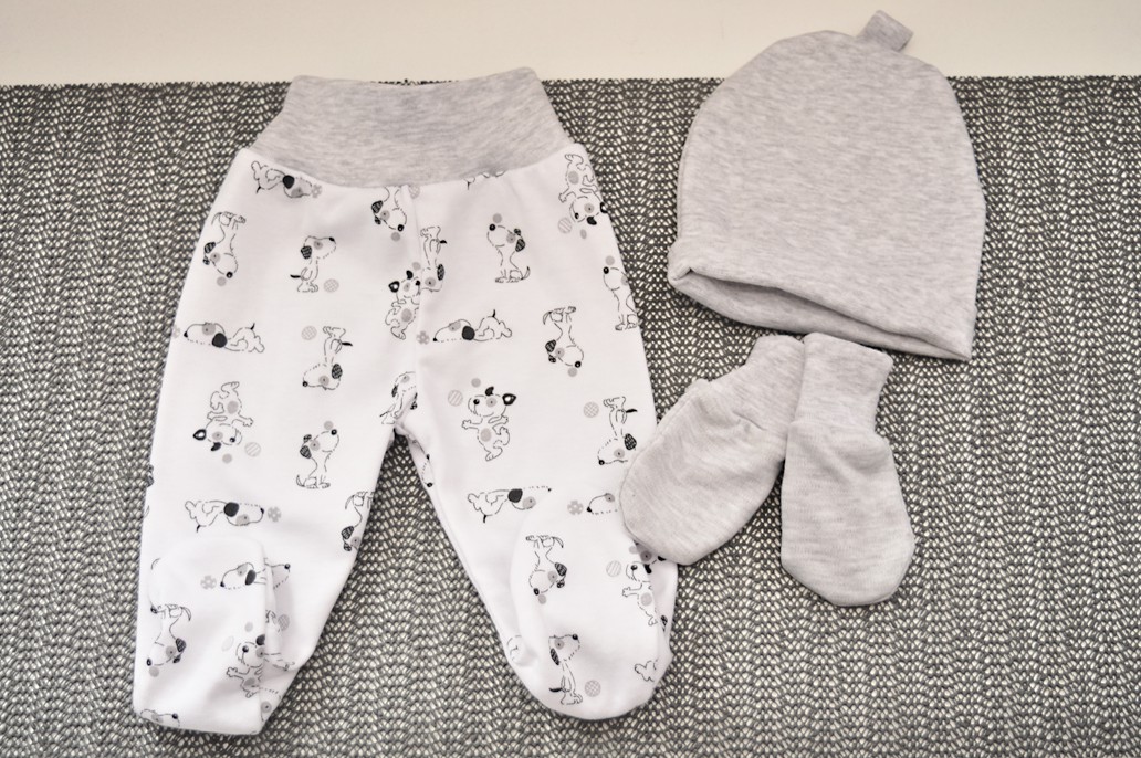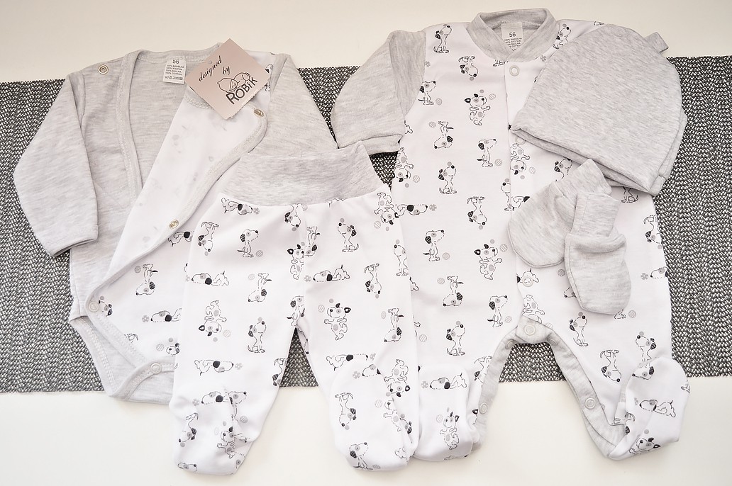 Niezbędna do szpitala wyprawka dla wcześniaka szara w pieski 5 - częściowa z polskiej bawełny. W skład kompletu wchodzą: