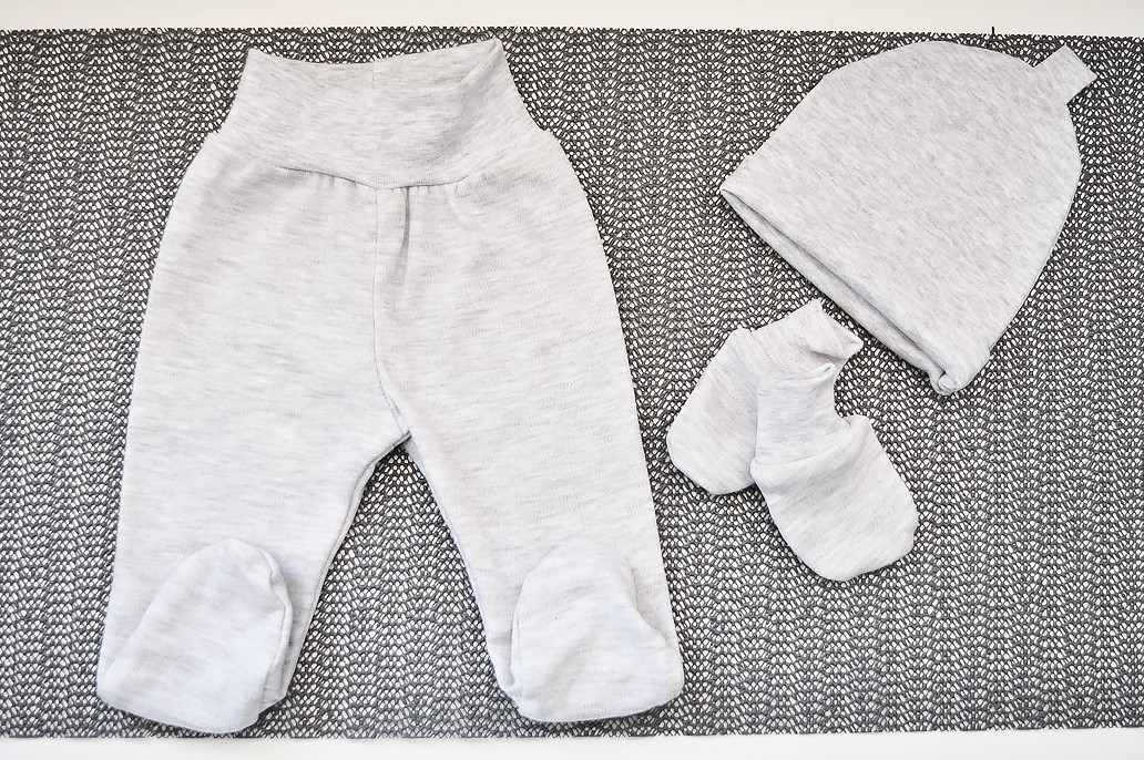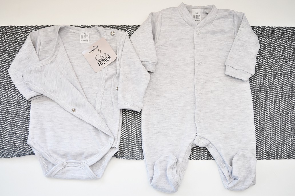 Szary komplet dla wcześniaka 5-częściowy - pajac, body kopertowe, półśpiochy, czapeczka, łapki.