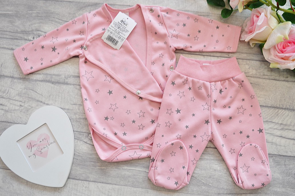 Pudrowy komplet dla wcześniaka 2-częściowy w gwiazdki - body kopertowe, półśpiochy.