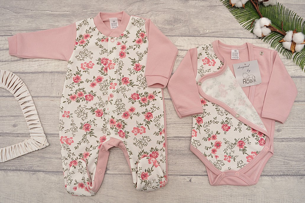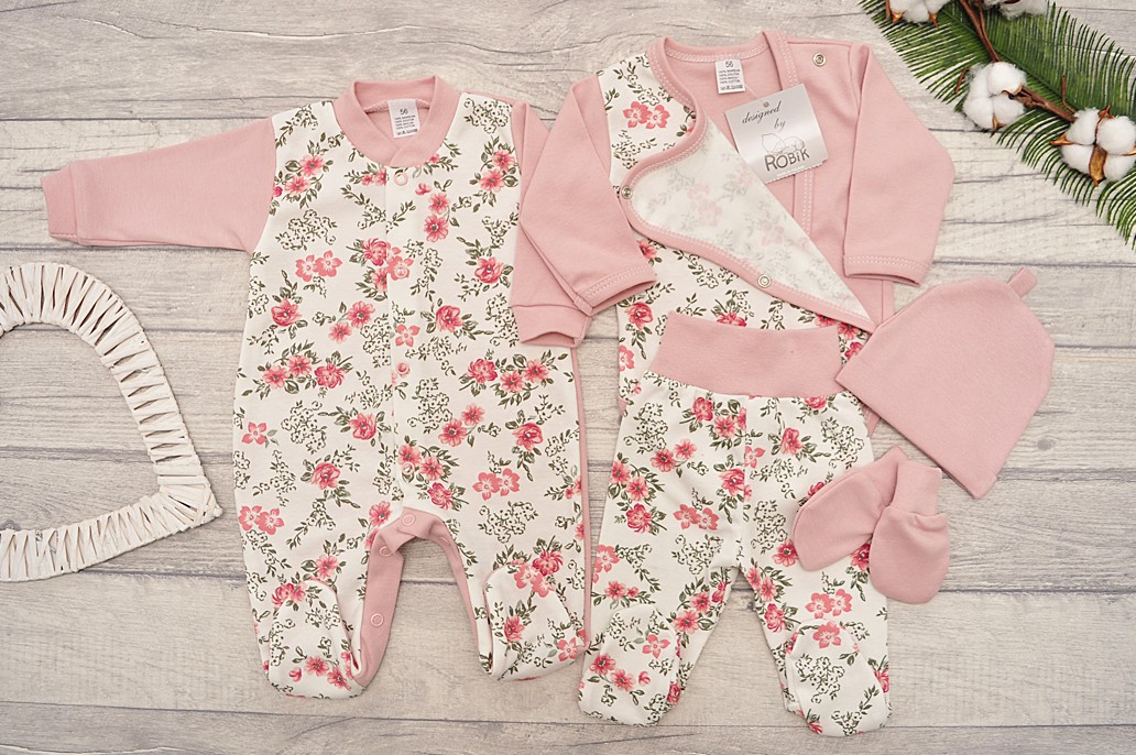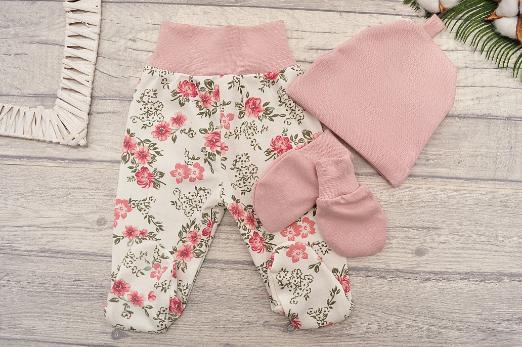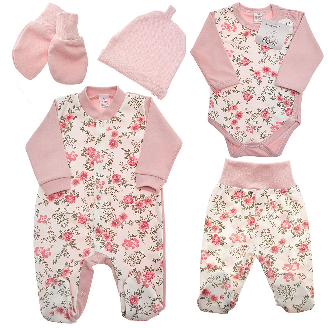 WYPRAWKA dla wcześniaka do szpitala 5 części pudrowa w kwiaty i liście wzór 354R
