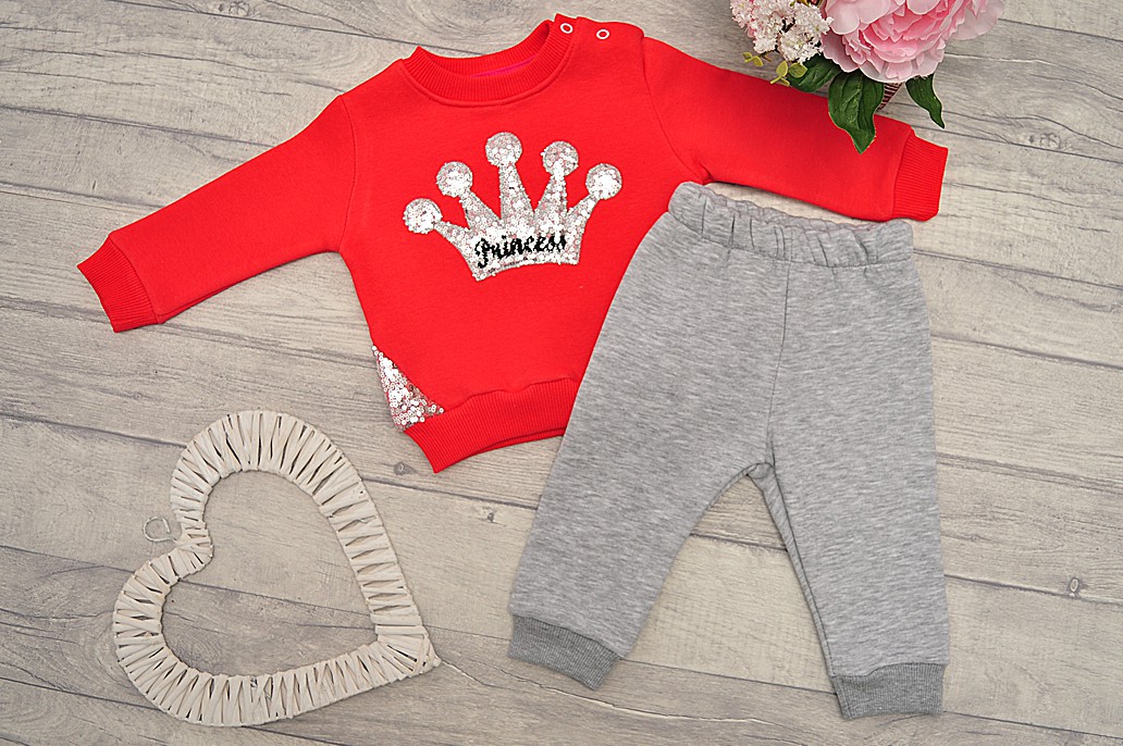 Ocieplany dres niemowlęcy 2-częściowy w skład którego wchodzą: szare spodnie oraz czerwona bluza z cekinowa koroną.