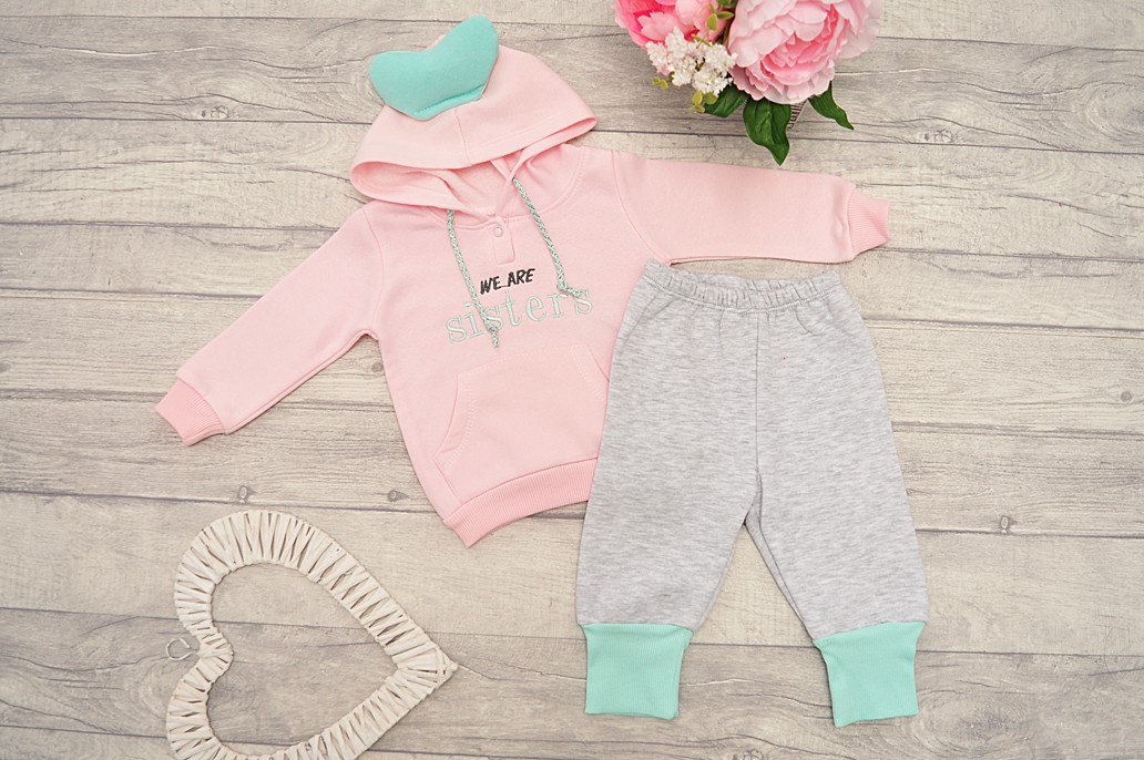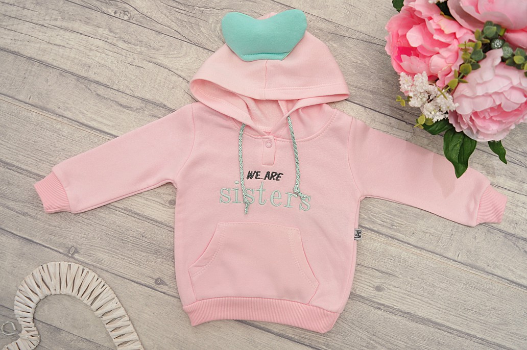 Bluza z dresowa z kapturem w kolorze różowym zapinana przy dekolcie na 1 napkę. Rękawy i dół bluzy zakończone ściągaczem. Z przodu bluza posiada wyszywany napis WE ARE SISTERS i kieszeń typu kangur. Przy kapturze ozdobny sznurek bez możliwości regulacji obwodu oraz puchata, miętowa kokarda. Szare spodenki dresowe posiadają elastyczną gumkę w pasie a ich nogawki wykończone są miętowym ściągaczem.