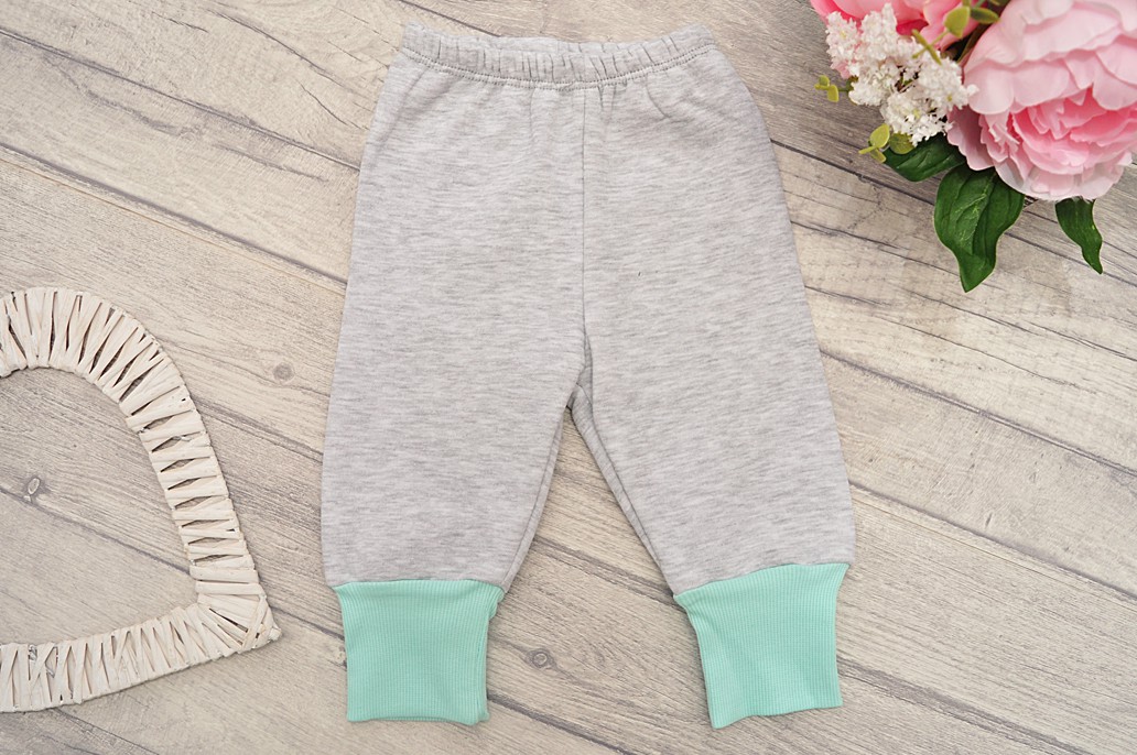 * szare spodnie dresowe z miętowymi ściągaczami przy nogawkach