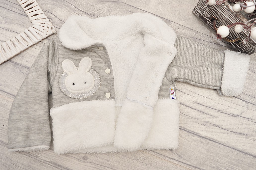 Bluza bolerko w szaro-białej kolorystyce zapinana na 3 napki. Bluza dziewczęca uszyta z dzianiny obszytej od spodu na całej długości, łącznie z rękawkami białym materiałem typu futerko. Szczególnego wyglądu dodaje tej niemowlęcej bluzie futerkowa aplikacja króliczka umieszczona na piersi, futerkowy kołnierzyk oraz dół obszyty białym futerkiem.