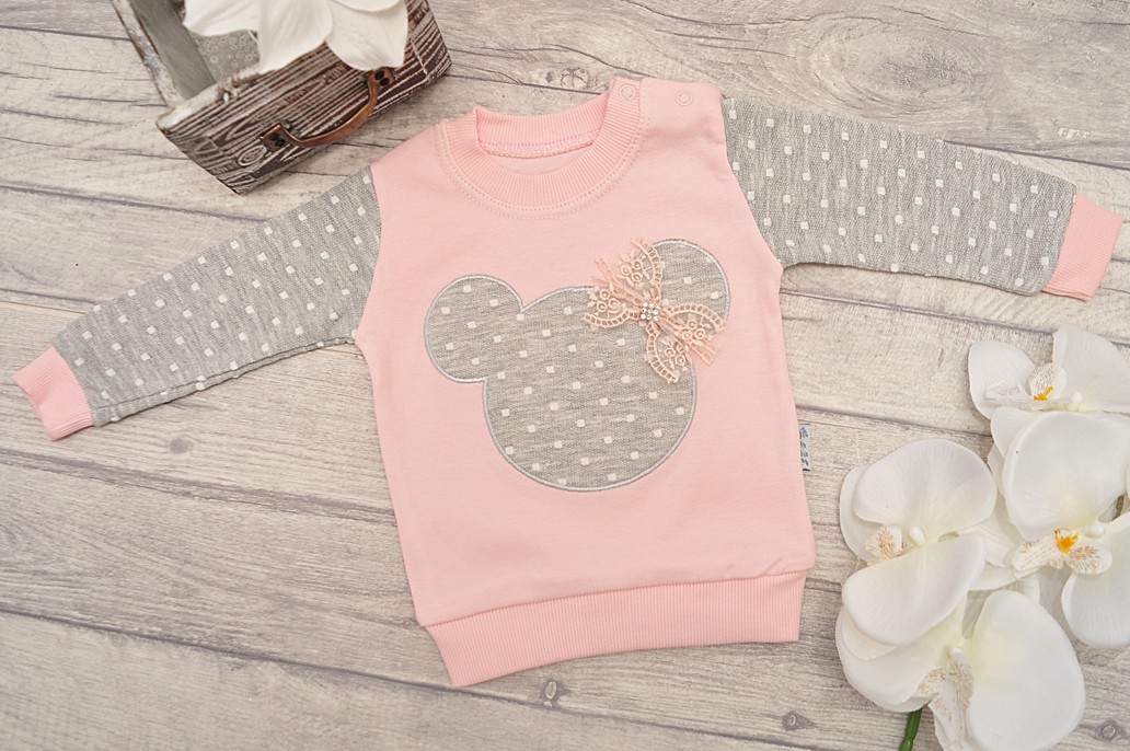 Bluza z dresowa w kolorze różowo-szarej kolorystyce. Przód i tył bluzy wykonany z różowej dzianiny, rękawy z dzianiny w kolorze szarym w białe grochy. Rękawy, dekolt i dół bluzy zakończone ściągaczem. Szczególnego wyglądu tej dziewczęcej bluzie dodają naszyta aplikacja szarej myszki z trójwymiarową, różową, koronkową kokardą z jetami. Bluza niemowlęca zapinana na ramieniu na 3 napki.