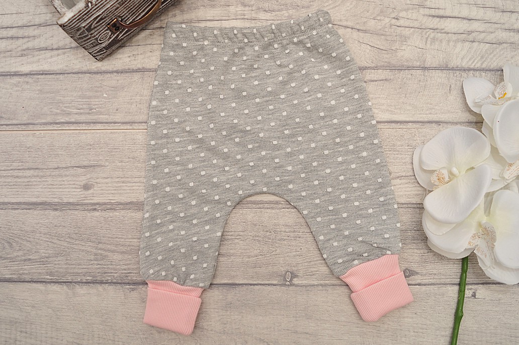 Spodenki dresowe w kolorze szarym w białe grochy posiadają elastyczną gumkę w pasie. Nogawki tych niemowlęcych spodenek wykończone są różowymi makietami z możliwością odwinięcia.