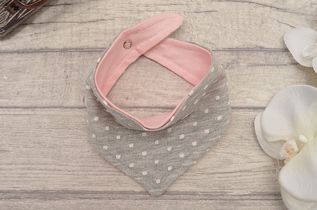 Uzupełnienie tego dziewczęcego kompletu stanowi trójkątna apaszka zapinana na napkę. Apaszka uszyta z 2 warstw materiału, warstwa zewnętrzna to szara dzianina w białe grochy od wewnątrz różowa bawełna.