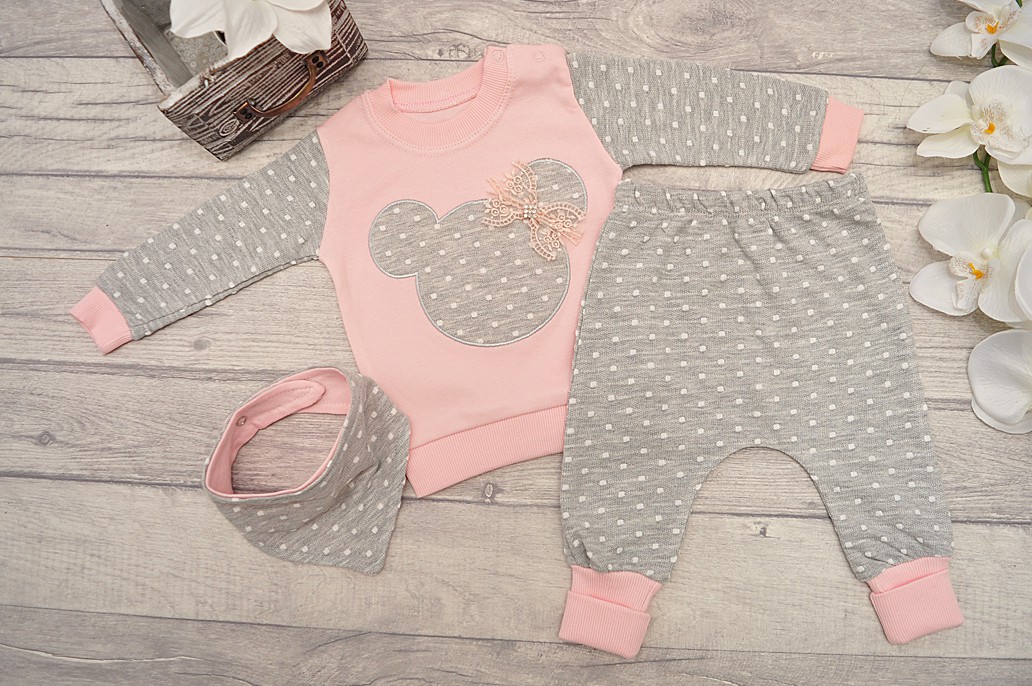Dres niemowlęcy 3-częściowy w skład którego wchodzą: szare spodnie w grochy, szara apaszka oraz różowo-szara bluza z myszką.