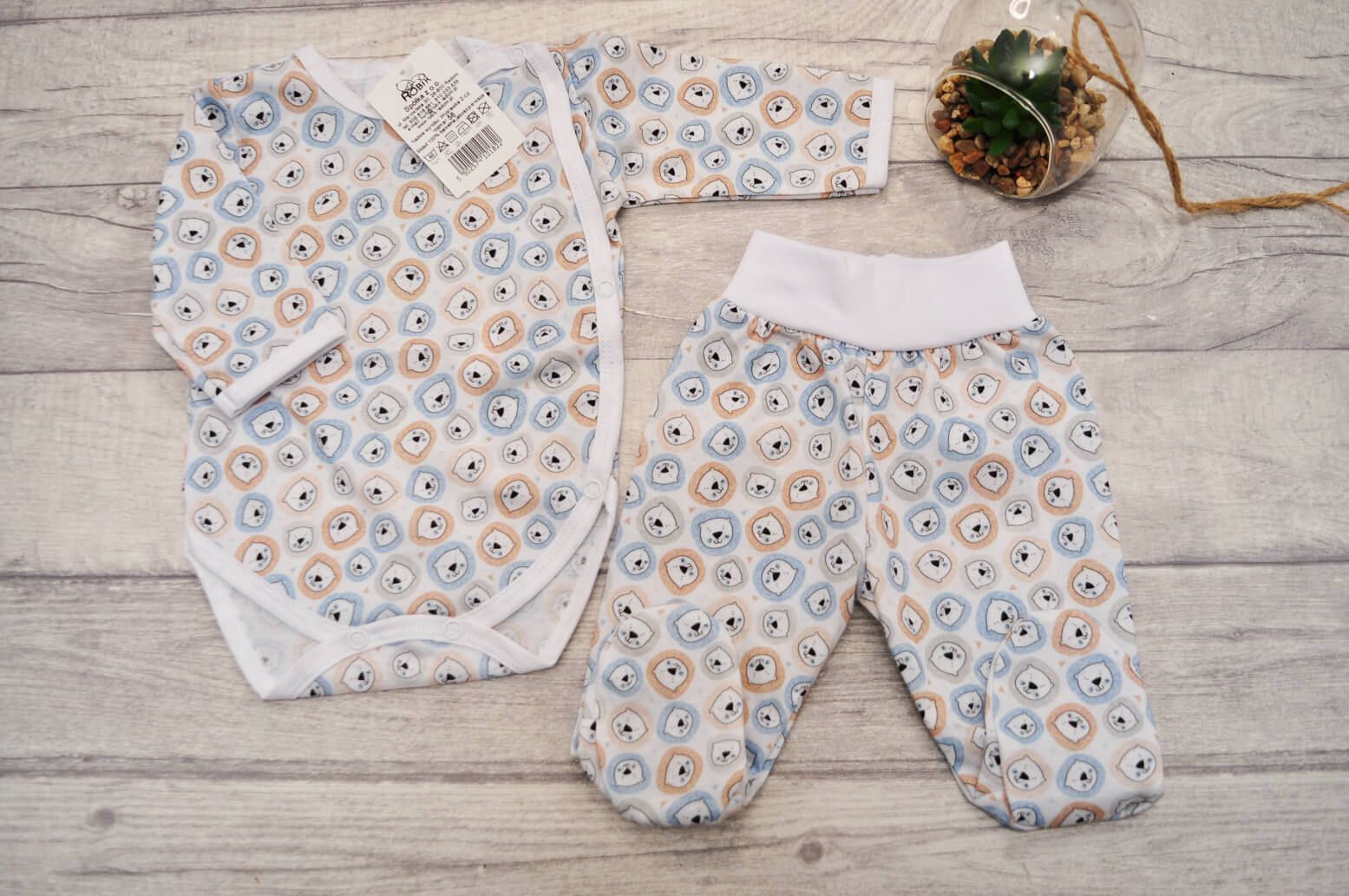 Komplet dla niemowlaka niebieskie jeżyki 2-częściowy - body kopertowe, półśpiochy.