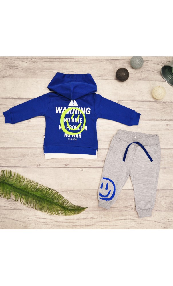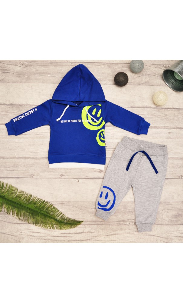 Dres niemowlęcy 2-częściowy w skład którego wchodzą: szare spodnie oraz niebieska bluza z kapturem.
