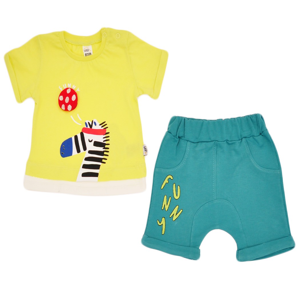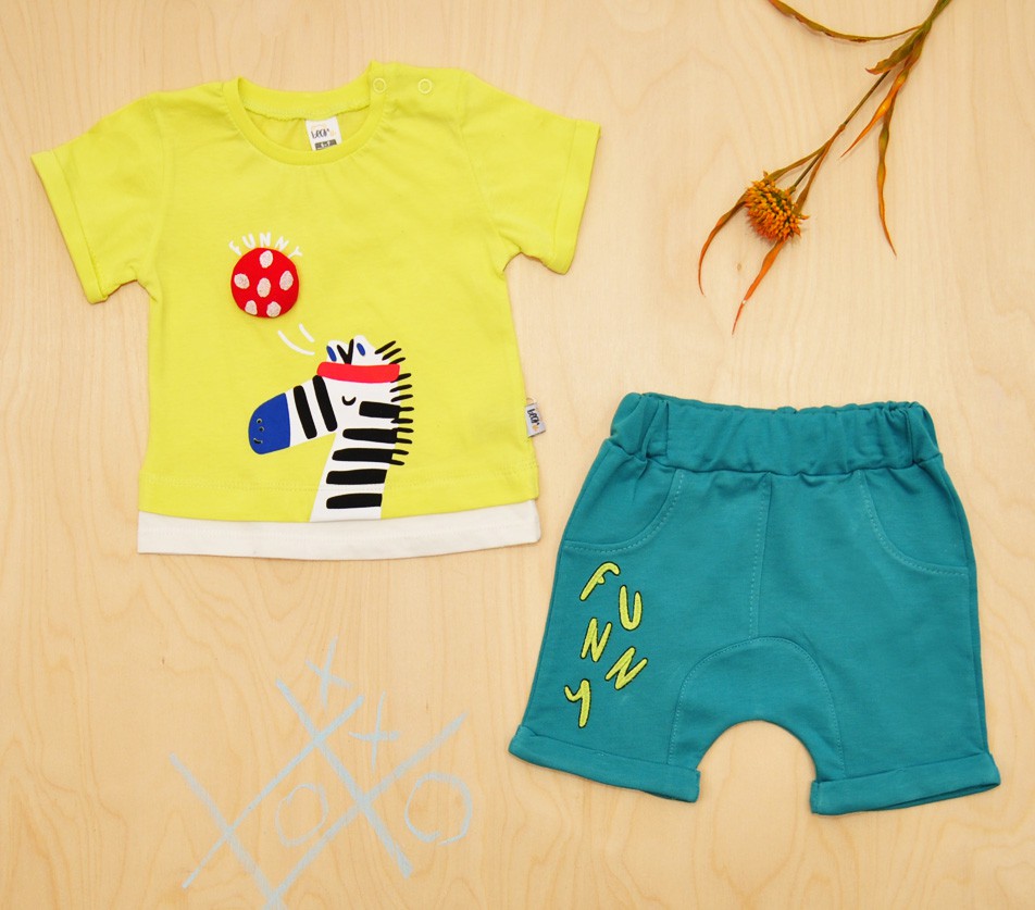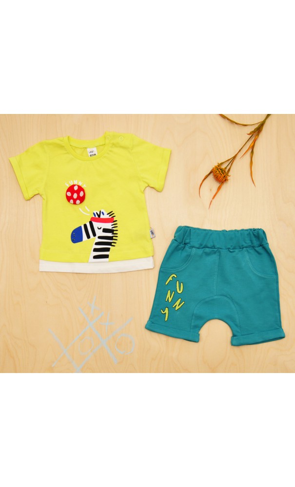 Bluzka bawełniana w limonkowej kolorystyce z napisem i ozdobą. Góra bluzki zakończona ściągaczem i rozpinana na dwie napy. Rękaw krótki. Szczególnego wyglądu tej niemowlęcej bluzeczce dodaje grafika zebry i doszyta aplikacją piłki z napisem FUNNY. Biała, materiałowa wstawka ozdabia dół t-shirtu.