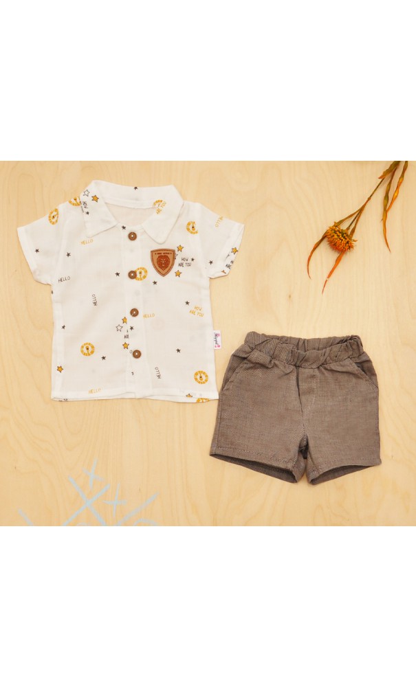 Bluzka bawełniana w białej kolorystyce. Góra bluzki wykończona kołnierzykiem, całość zapinana na 4 guziczki, rękaw krótki. Szczególnego wyglądu tej niemowlęcej bluzeczce dodaje brązowa aplikacja z lwem oraz nadruki gwiazdek, lwów i napisów: HOW ARE YOU i HELLO.