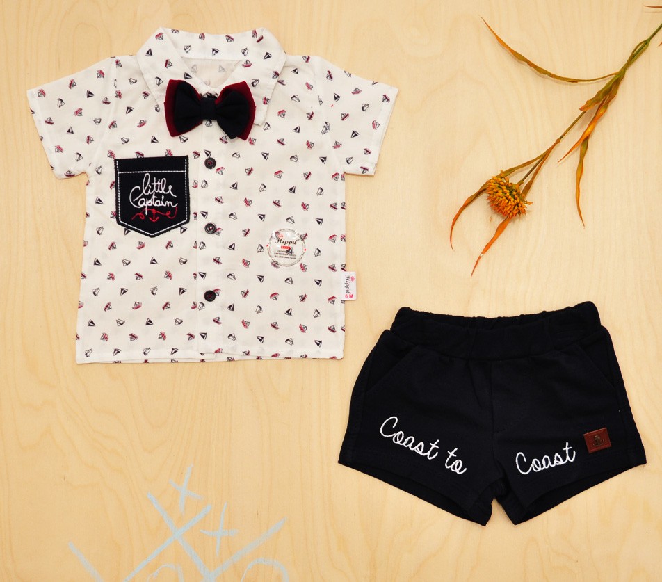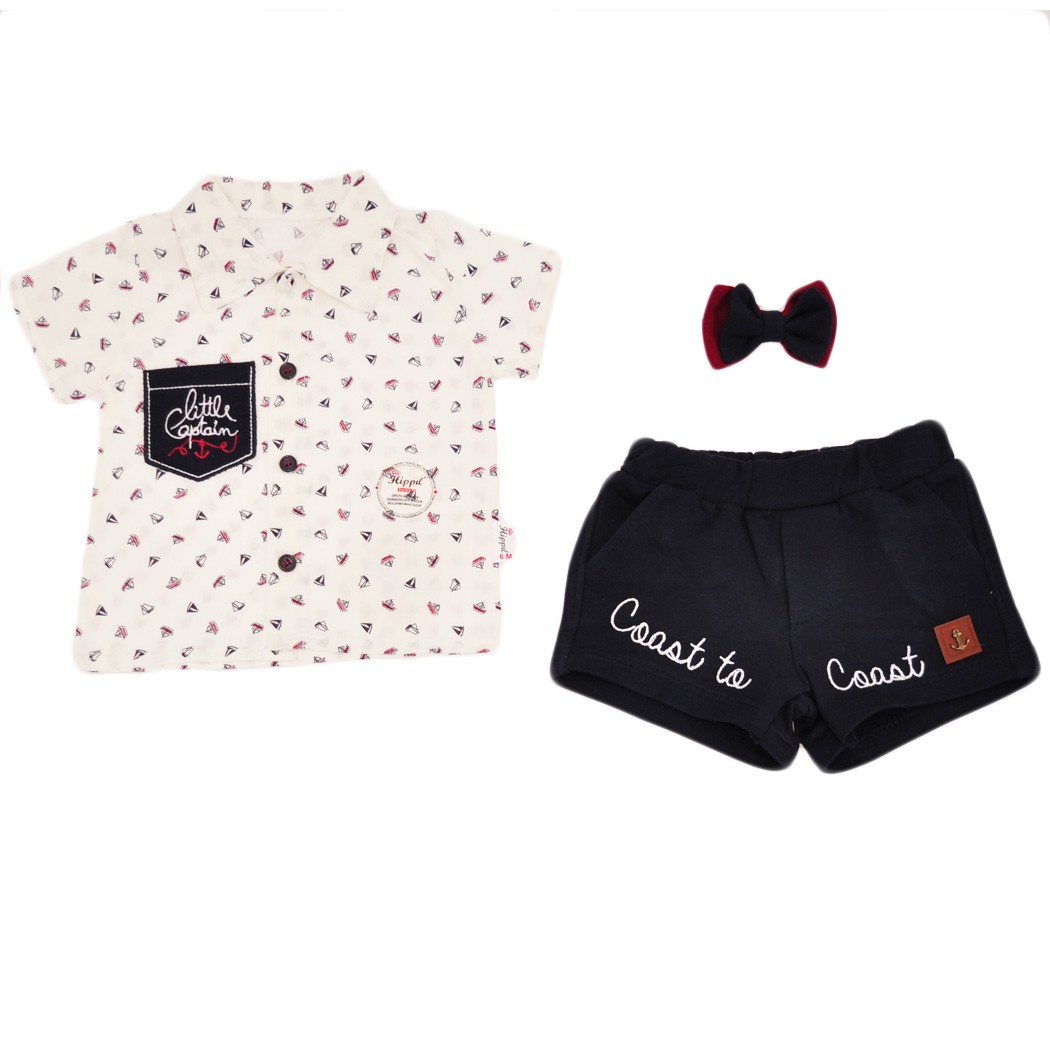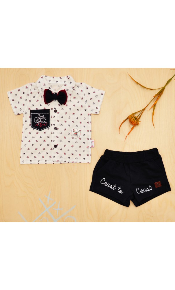 KOMPLET z muszką biało- granatowy LITTLE CAPITAN w żaglówki koszulka i spodnie