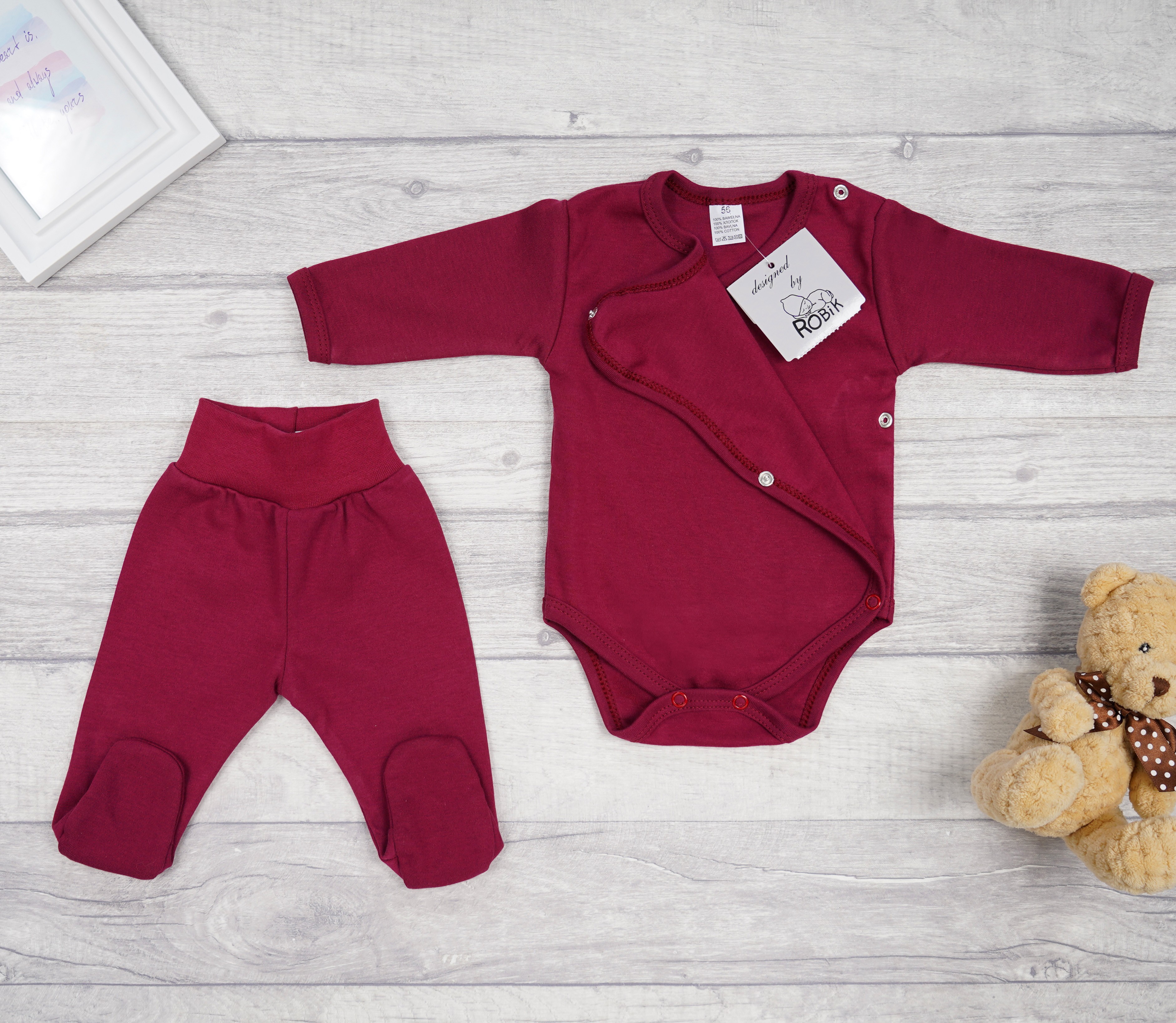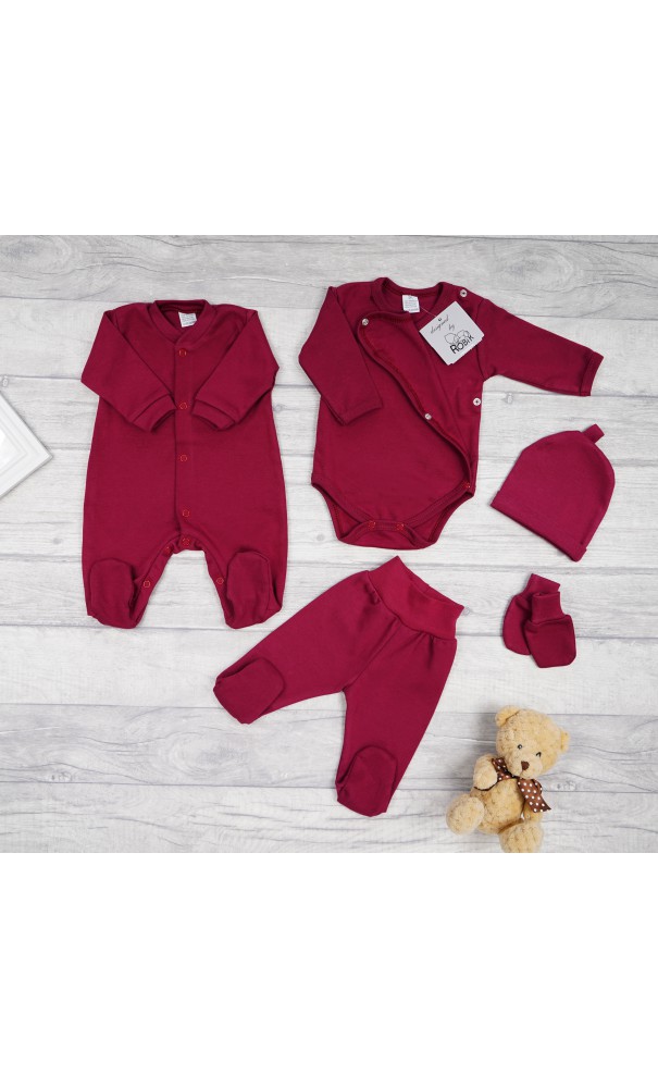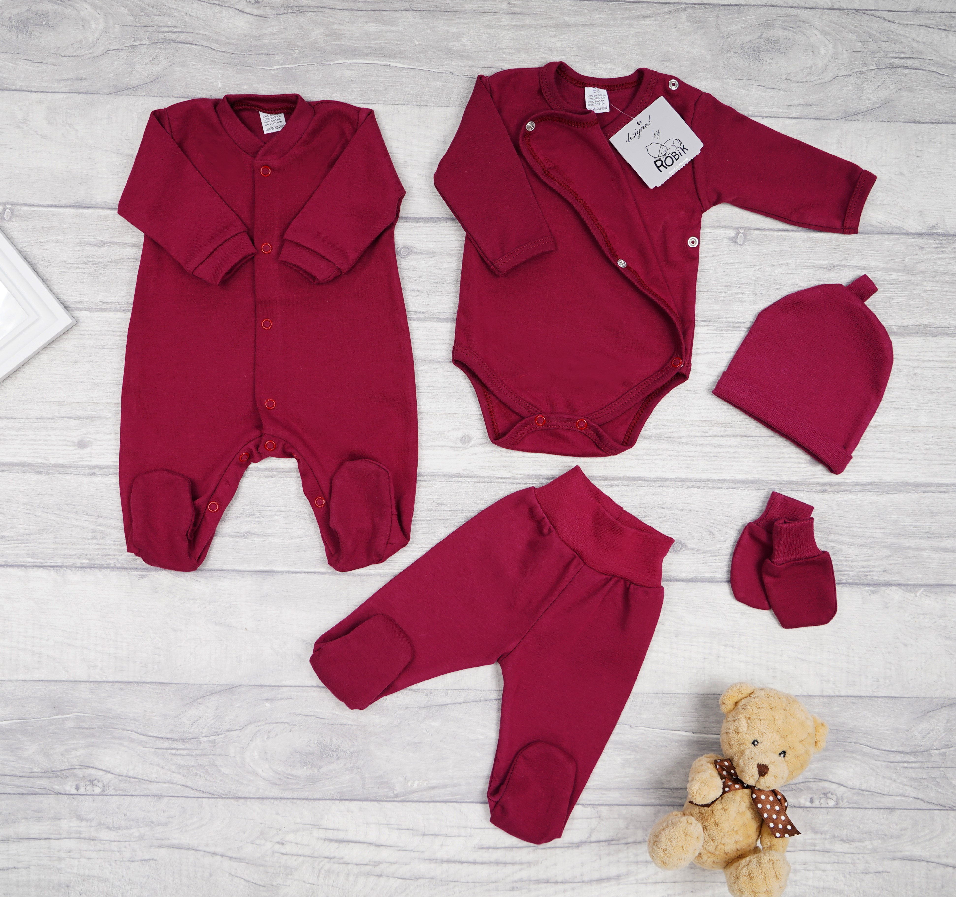 Niezbędna do szpitala bordowa wyprawka dla noworodka do szpitala 5 - częściowa z polskiej bawełny. W skład kompletu wchodzą: