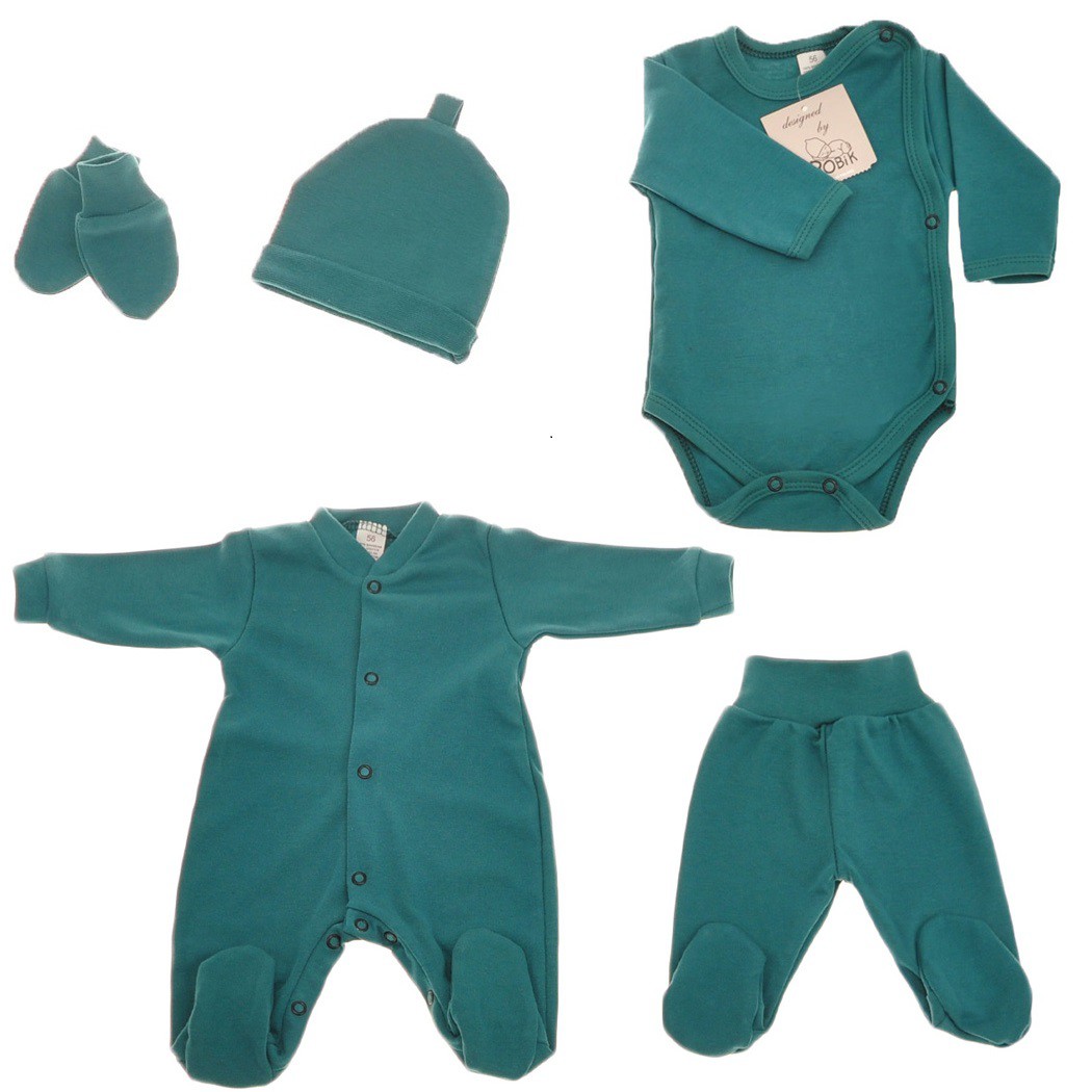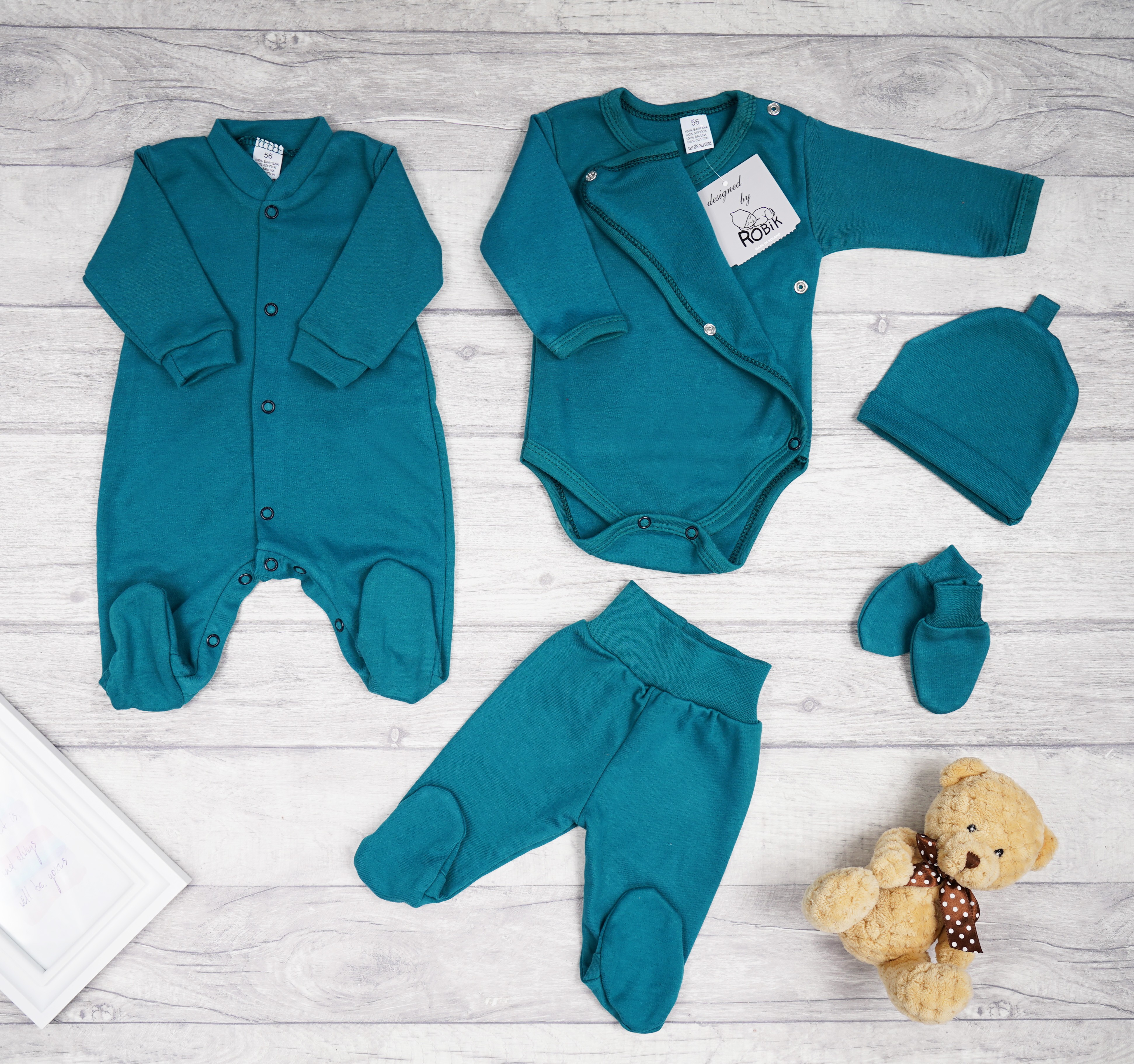 Butelkowo- zielony komplet dla wcześniaka 5-częściowy - pajac, body kopertowe, półśpiochy, czapeczka, łapki.