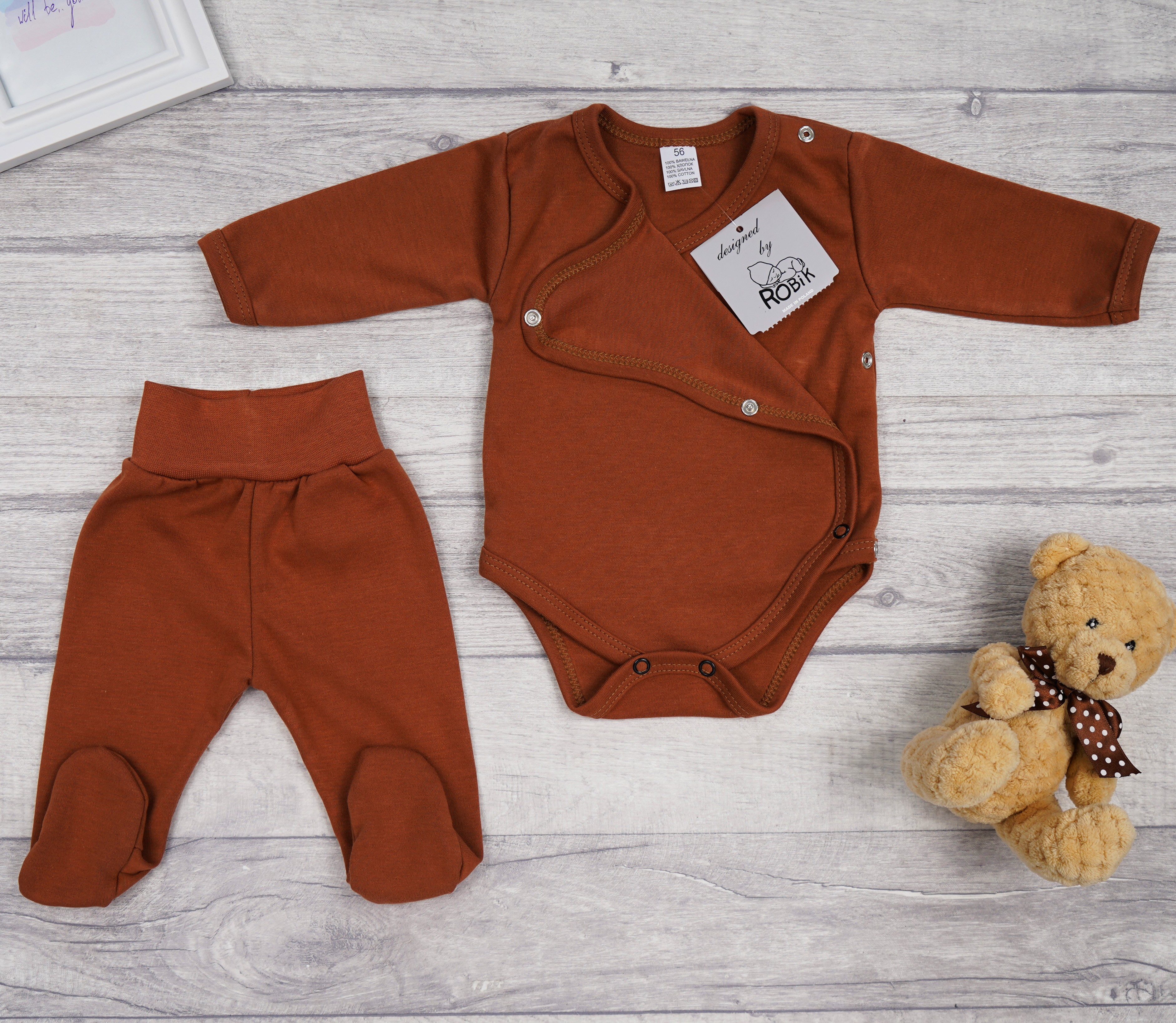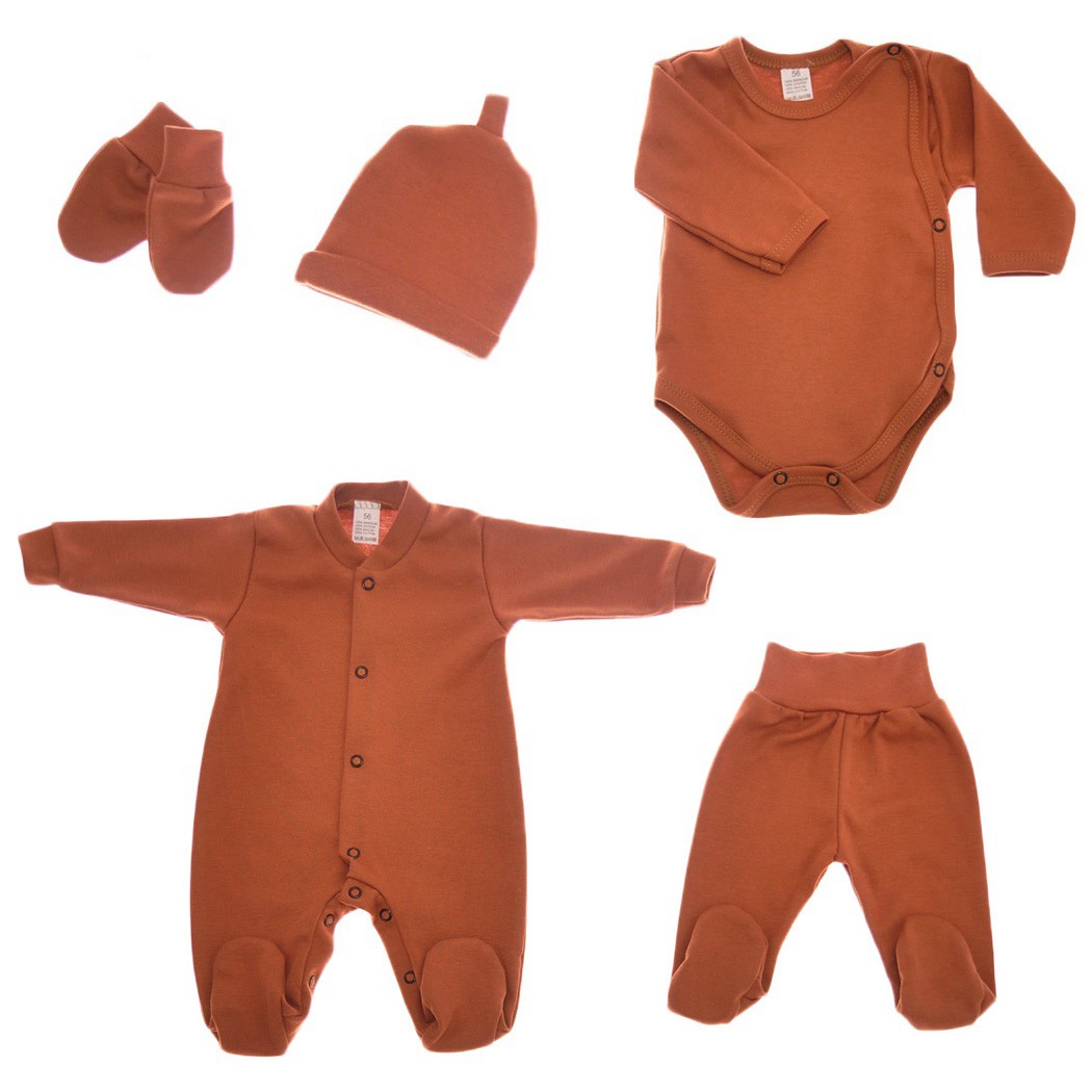 Komplet brązowy dla wcześniaka 5-częściowy - pajac, body kopertowe, półśpiochy, czapeczka, łapki