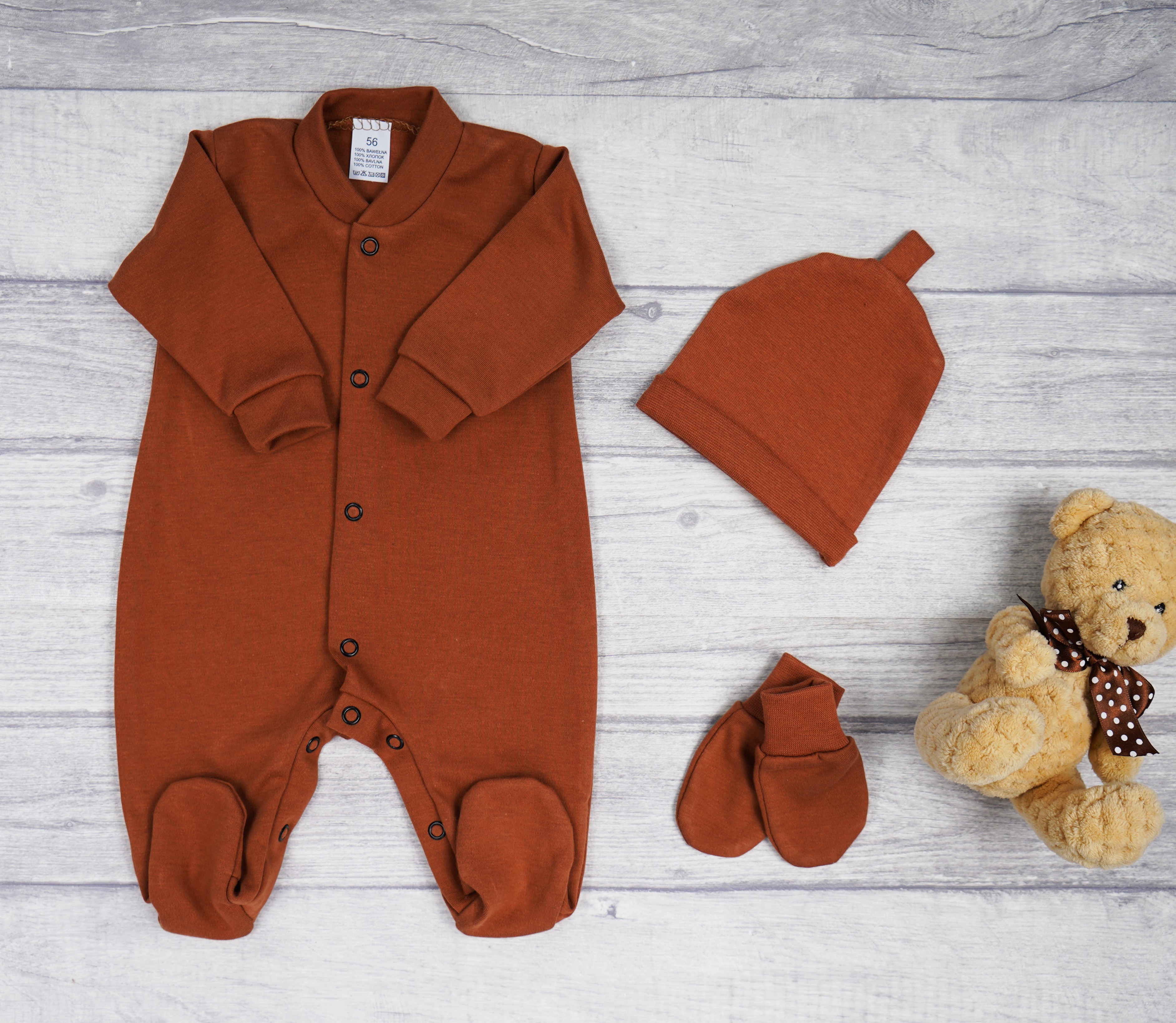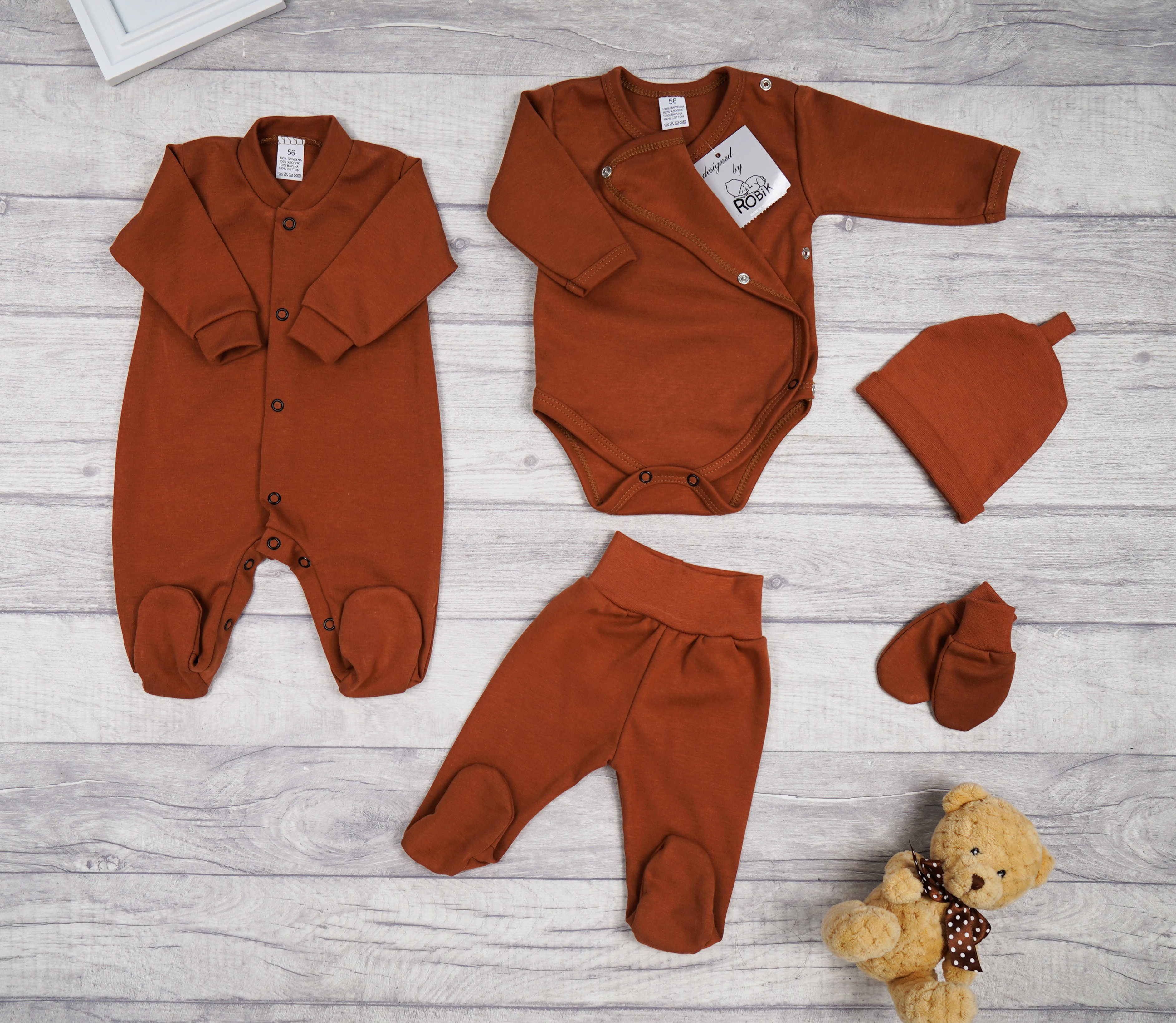 Niezbędna do szpitala brązowa wyprawka dla wcześniaka 5 - częściowa z polskiej bawełny. W skład kompletu wchodzą:
