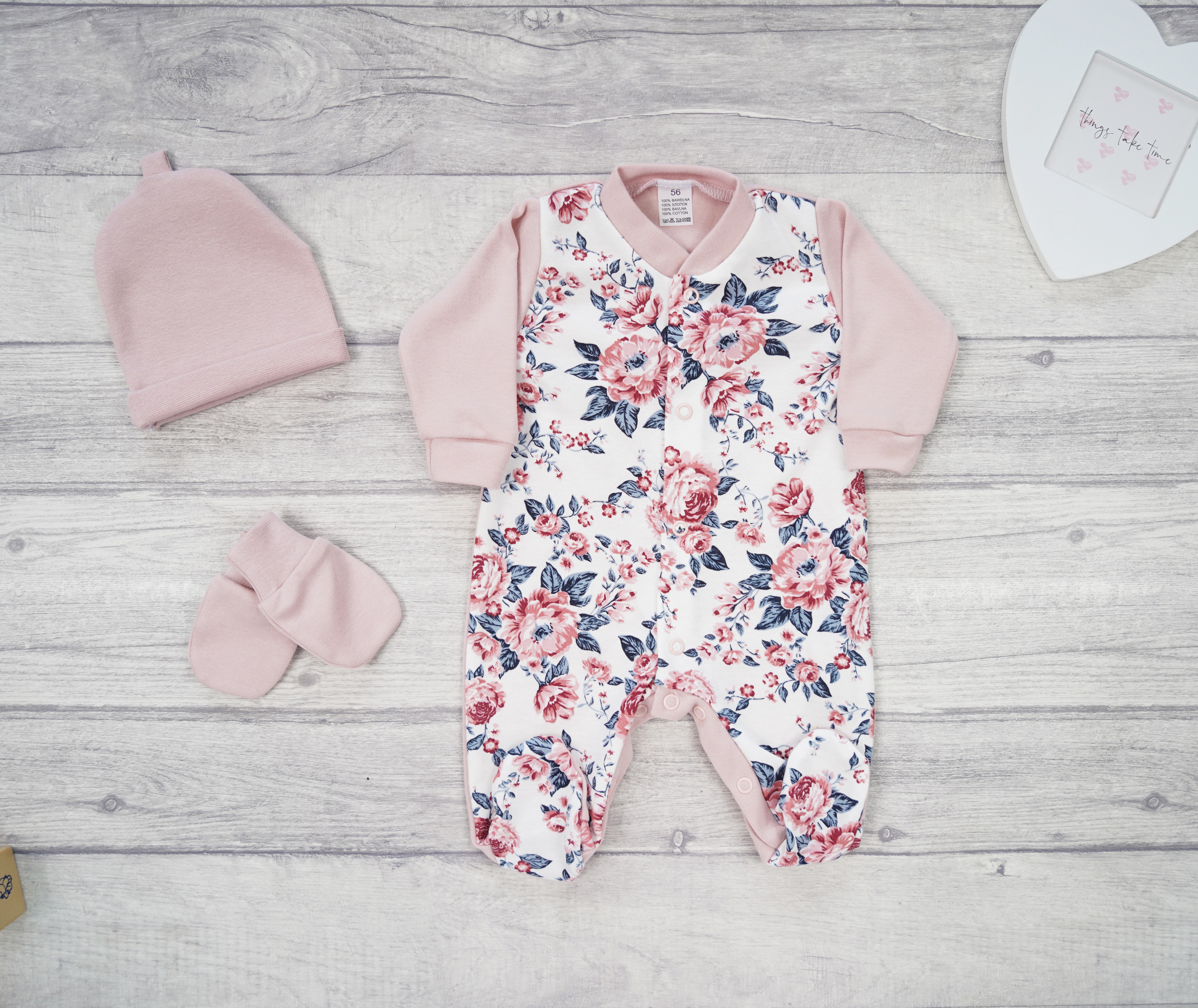 Pudrowo różowy z ecru komplet niemowlęcy 5-częściowy w kwiaty - pajac, body kopertowe, półśpiochy, czapeczka, łapki.