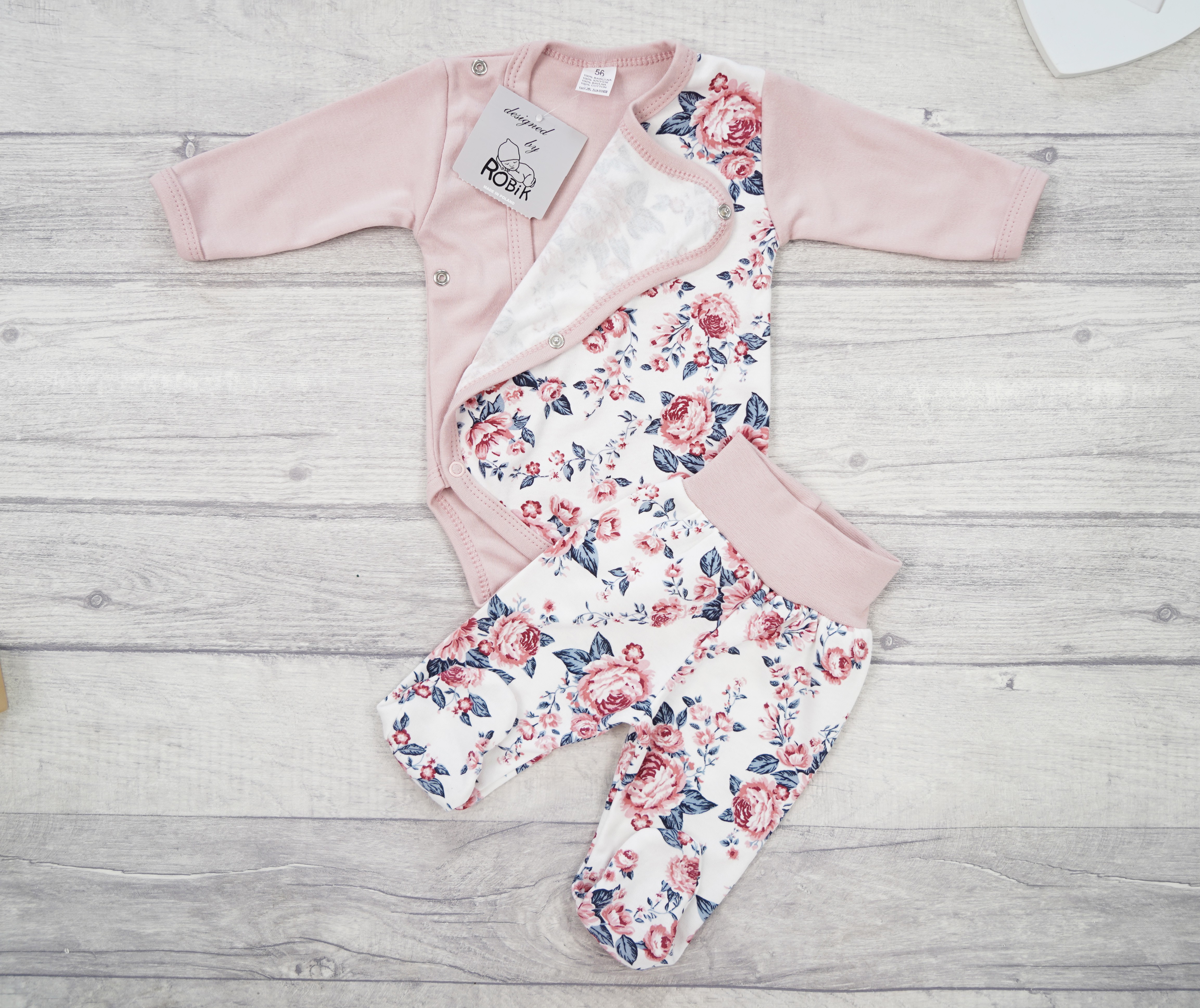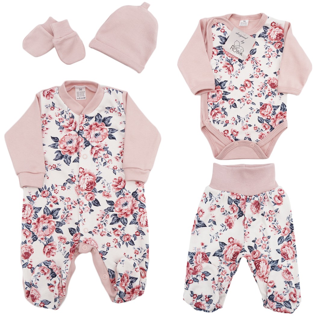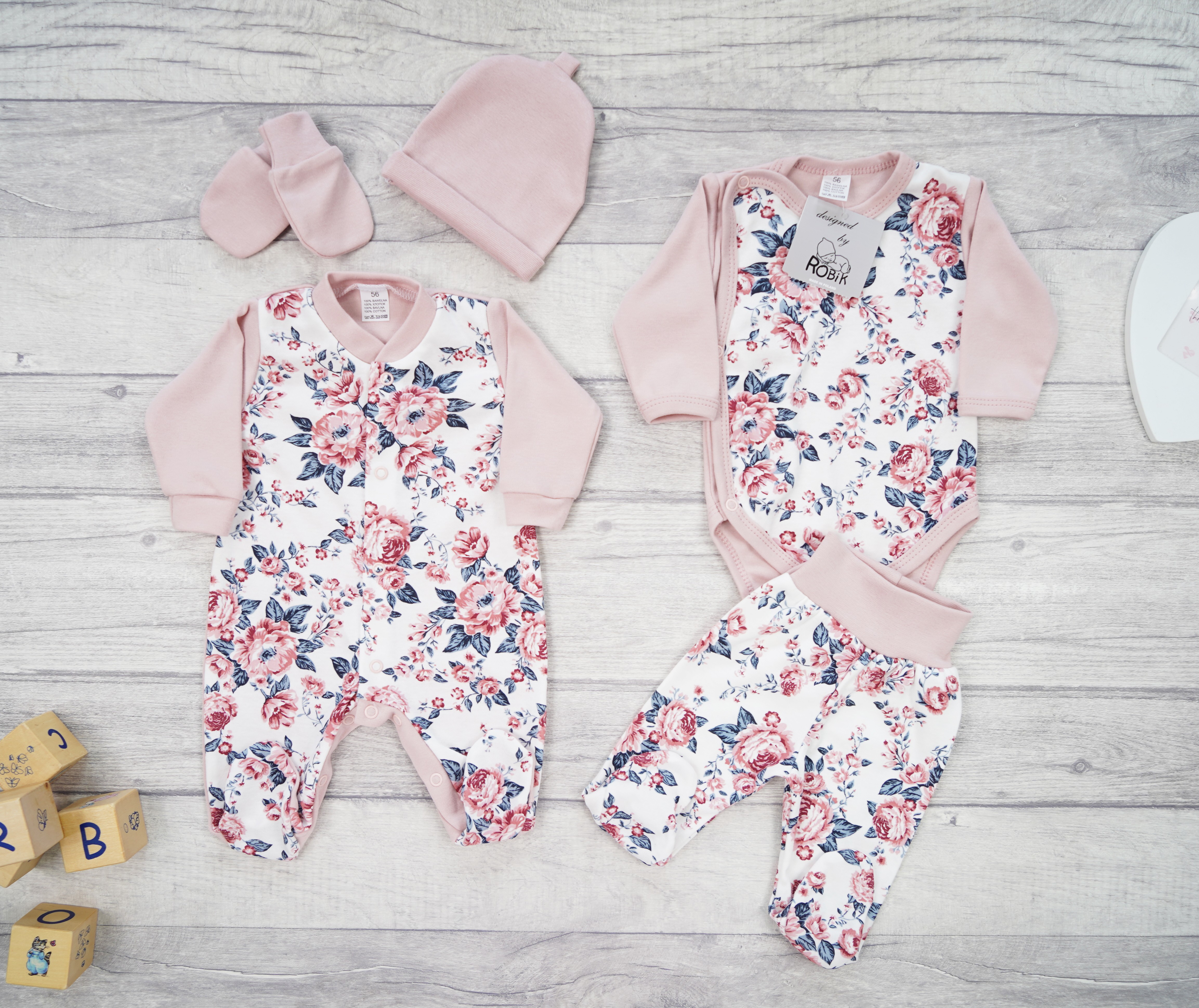 WYPRAWKA dla noworodka do szpitala 5 części pudrowa kwiaty ciemne liście 373r