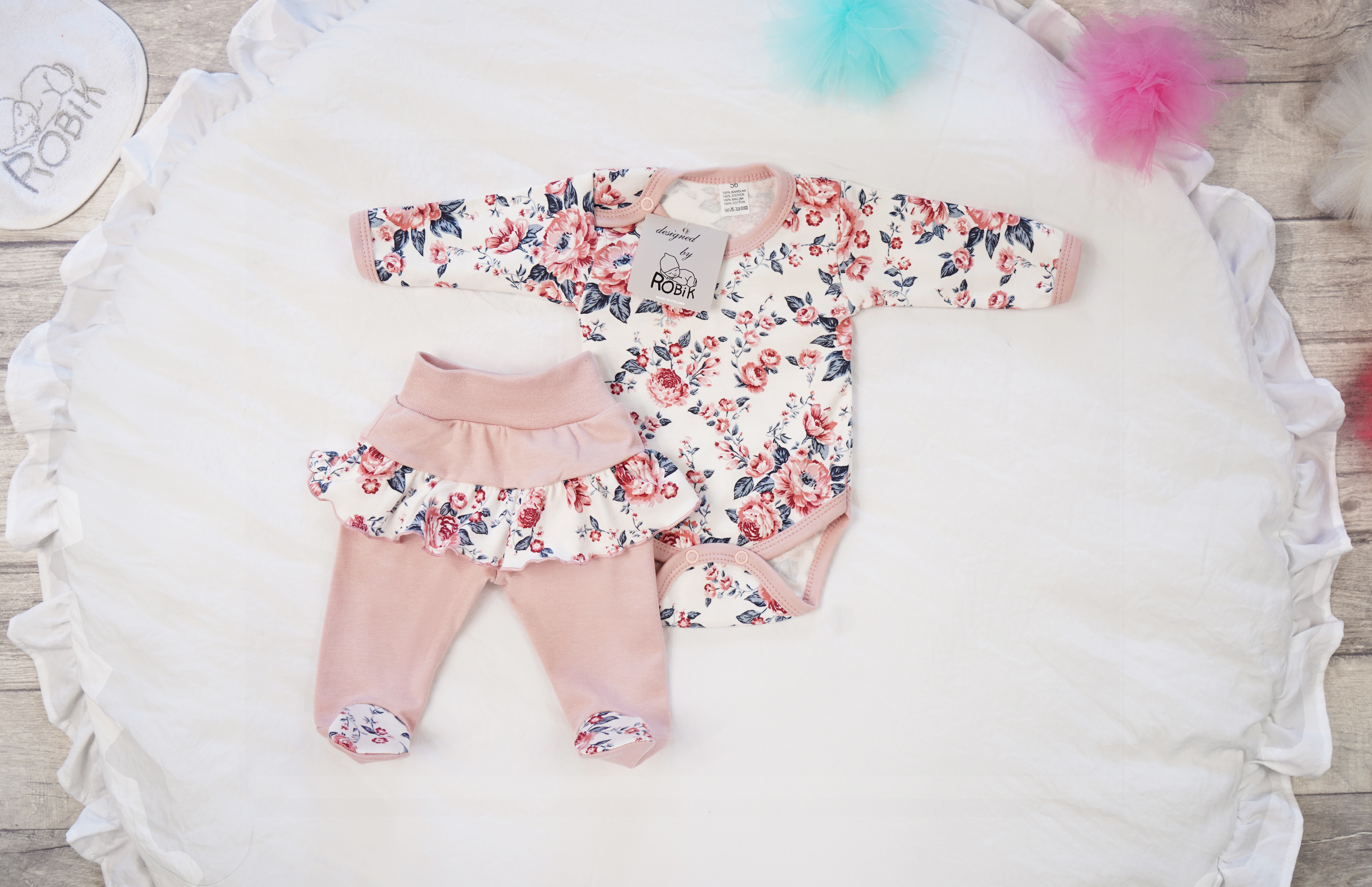 Komplet niemowlęcy dla dziewczynki pudrowy w róże i liście 2-częściowy - body, półśpiochy z falbanką.