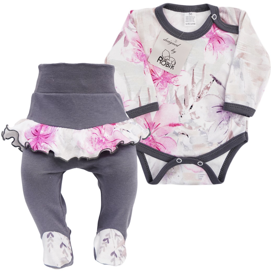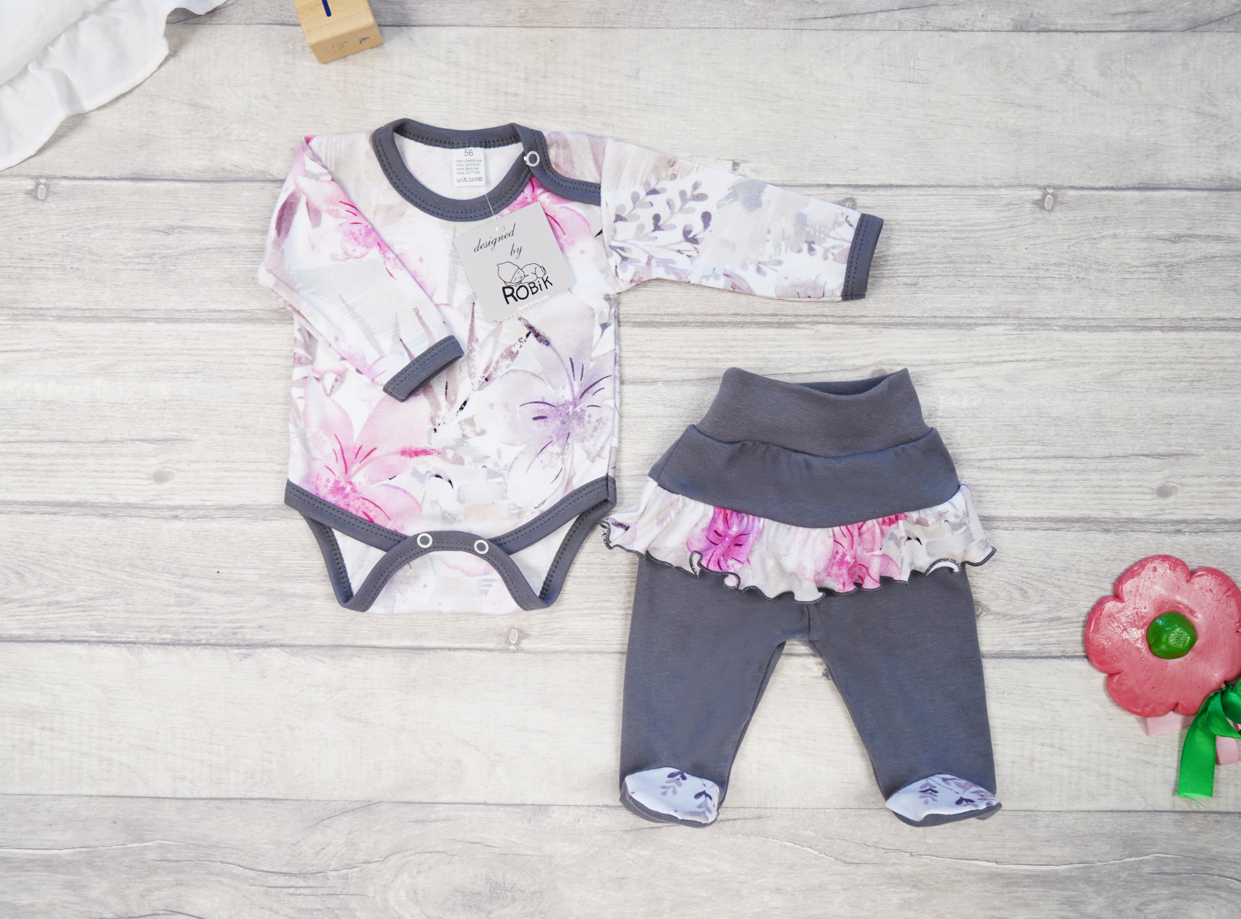 Komplet niemowlęcy dla dziewczynki grafitowy w kwiaty 2-częściowy - body, półśpiochy z falbanką.