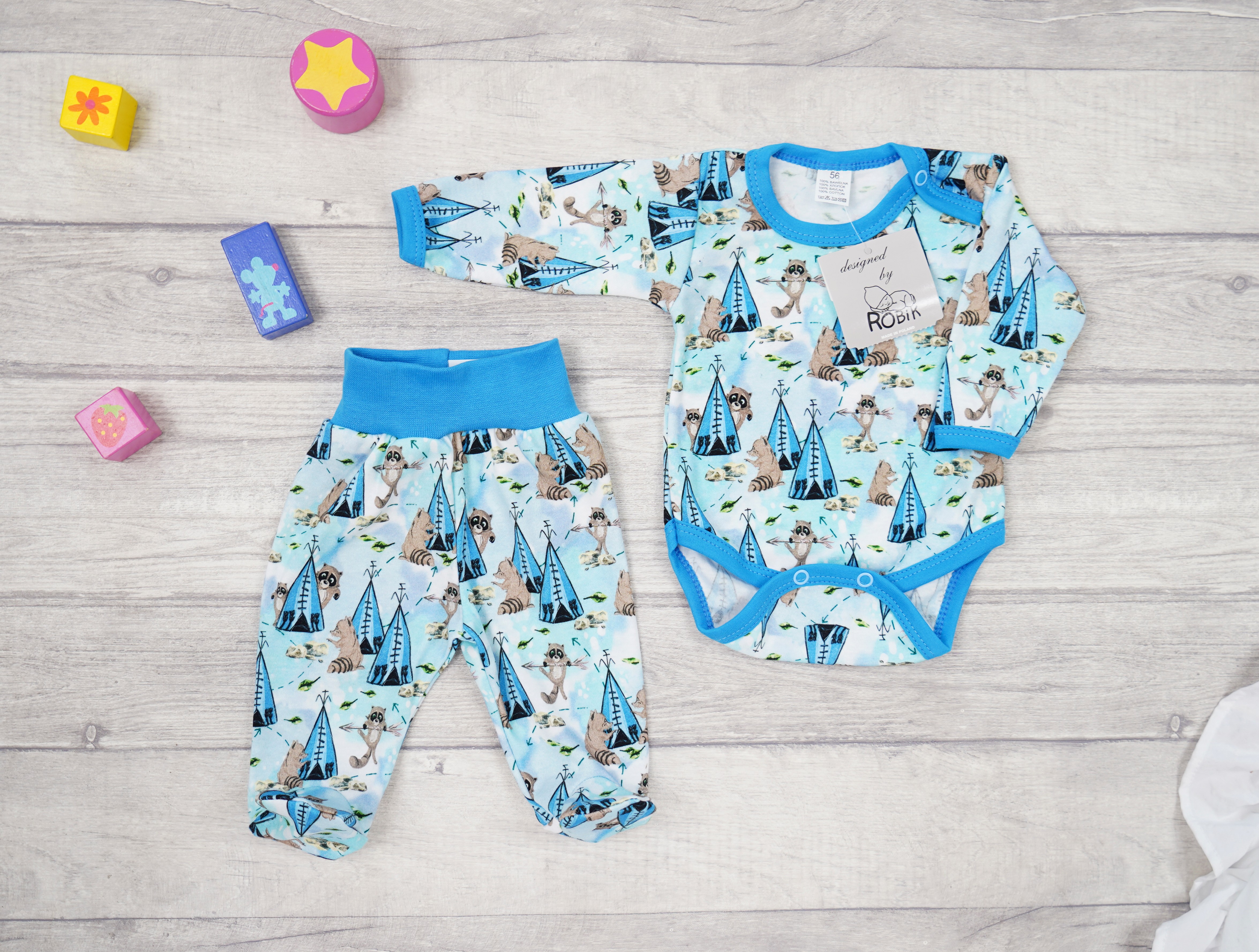 Komplet dla wcześniaka niebieski w szopy i tipi 2-częściowy - body, półśpiochy.