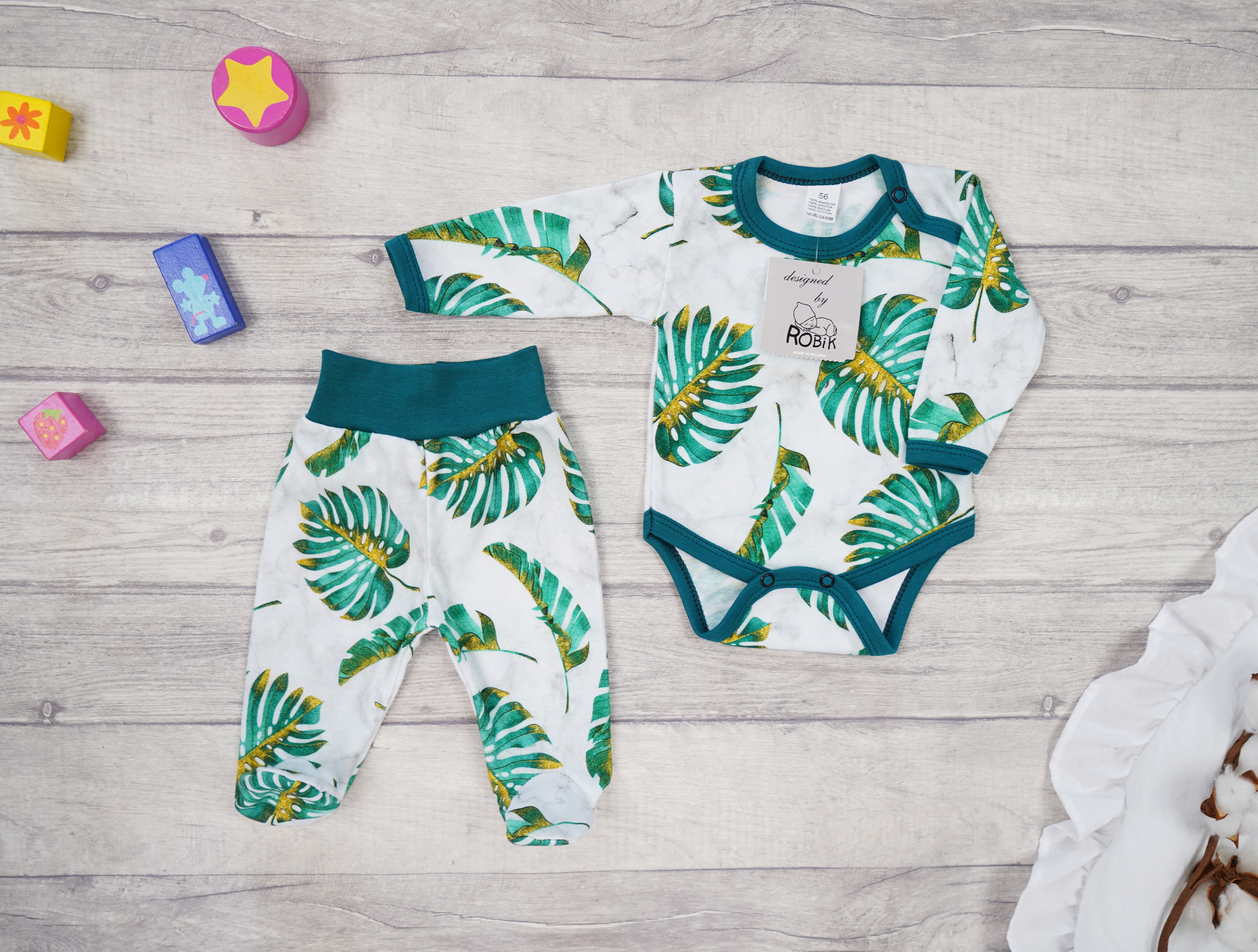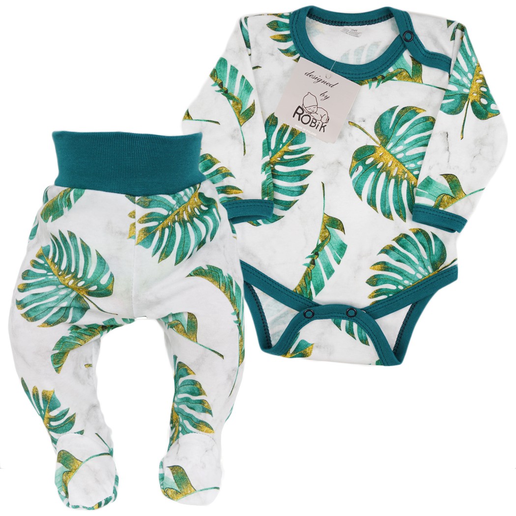 Komplet dla wcześniaka biało- zielony w liście monstery 2-częściowy - body, półśpiochy. Na bieli posiada motyw MARMURKOWY.