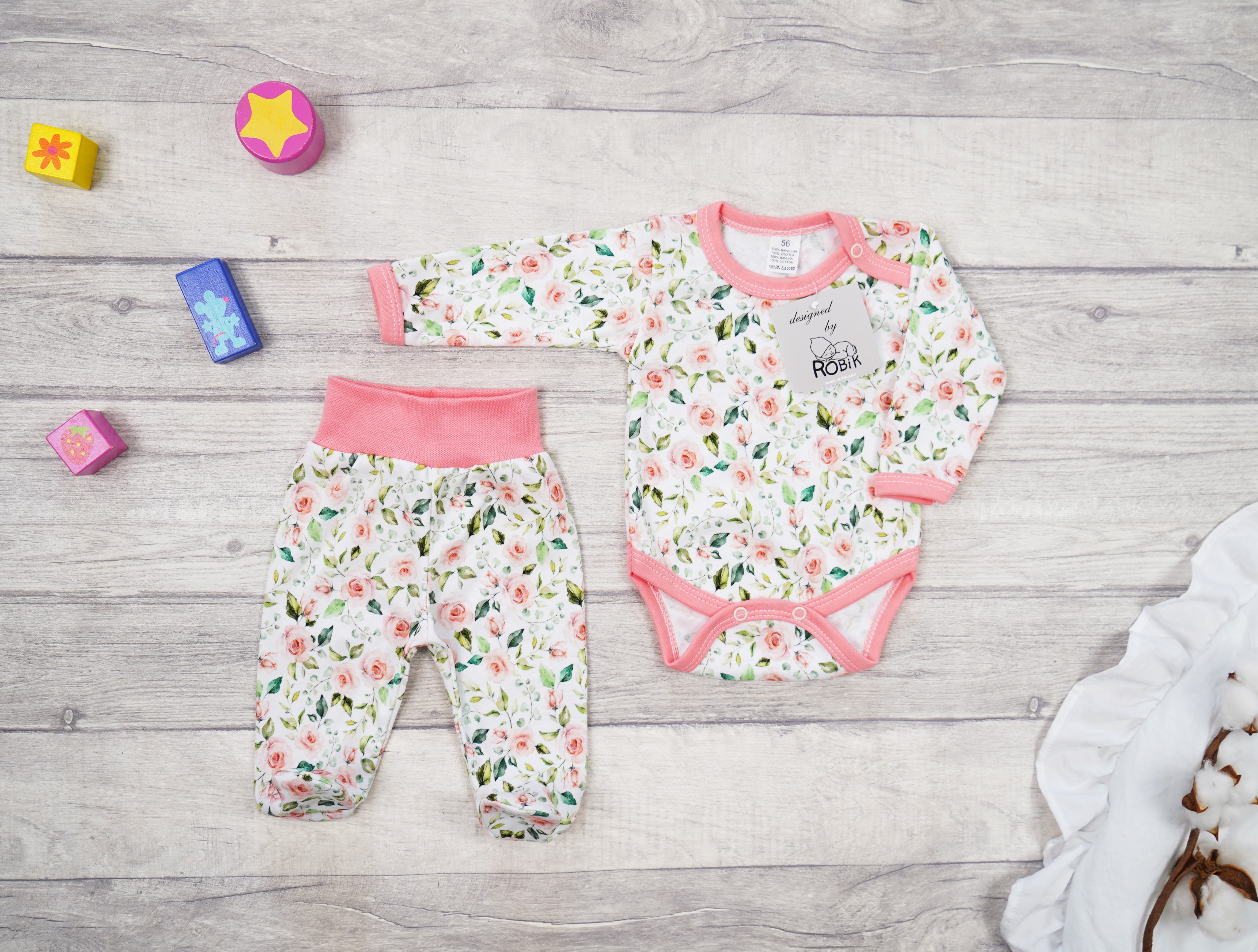 Komplet 2cz body + półśpiochy róż wz. róże zielone liście