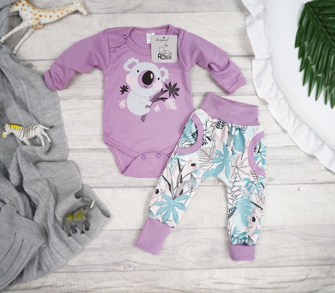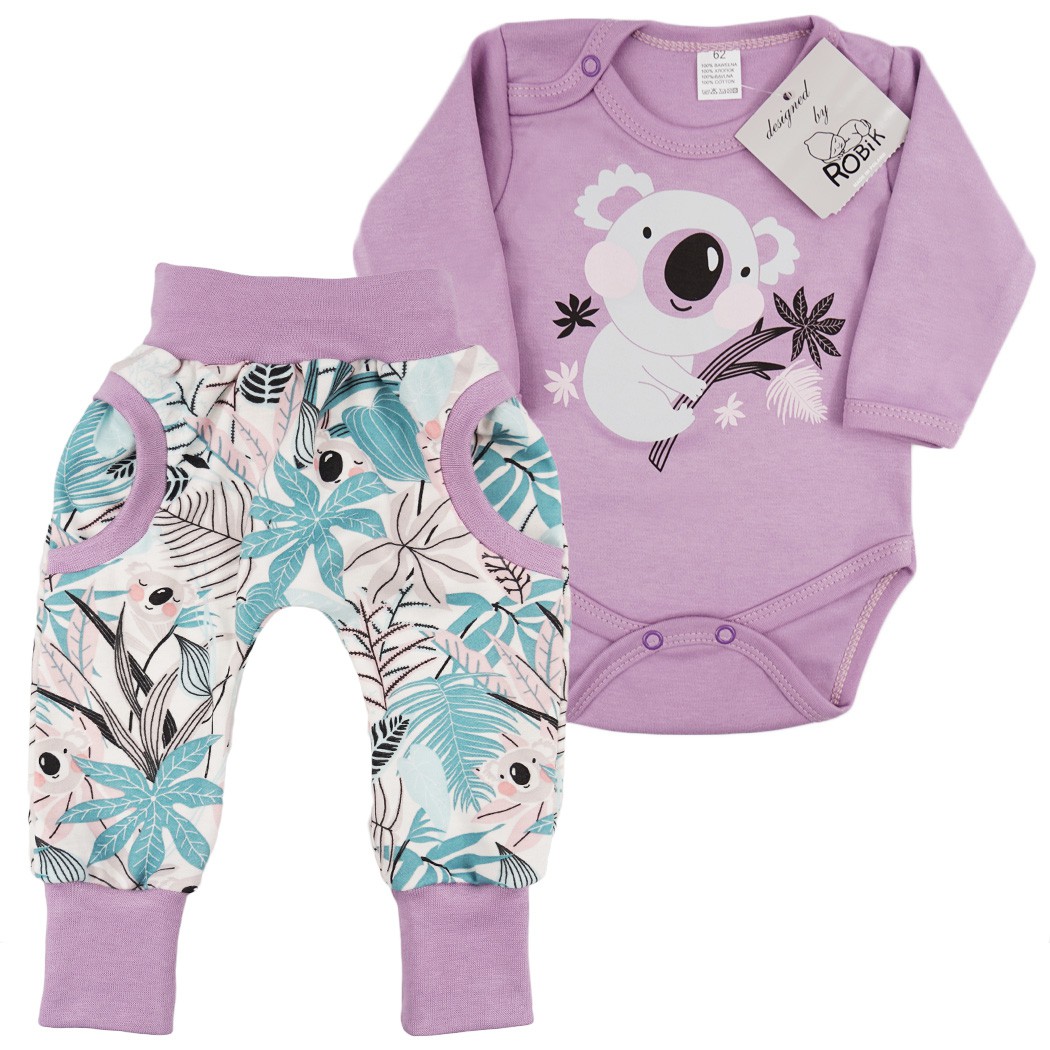 Wrzosowy komplet dla niemowlaka w misie koala 2-częściowy - body, spodnie z kieszeniami.