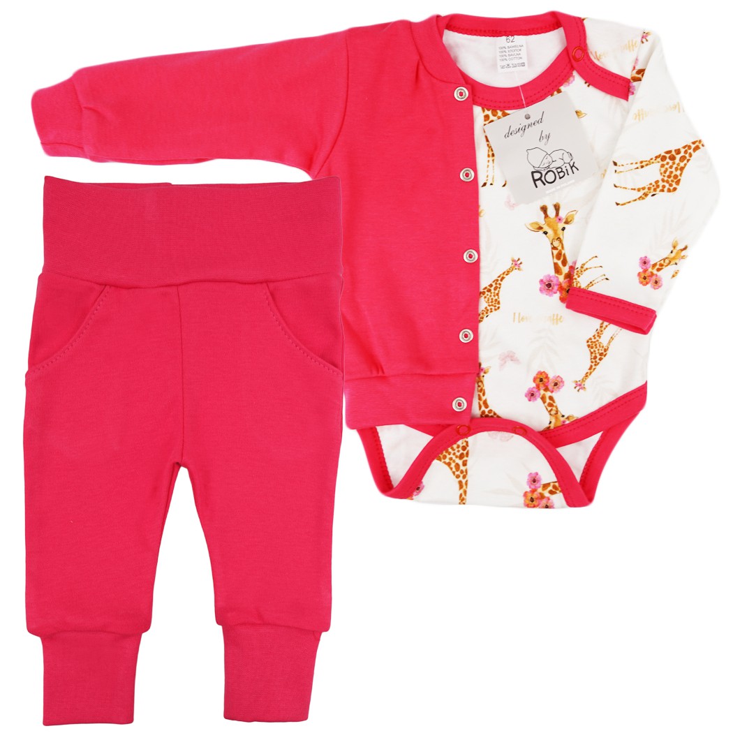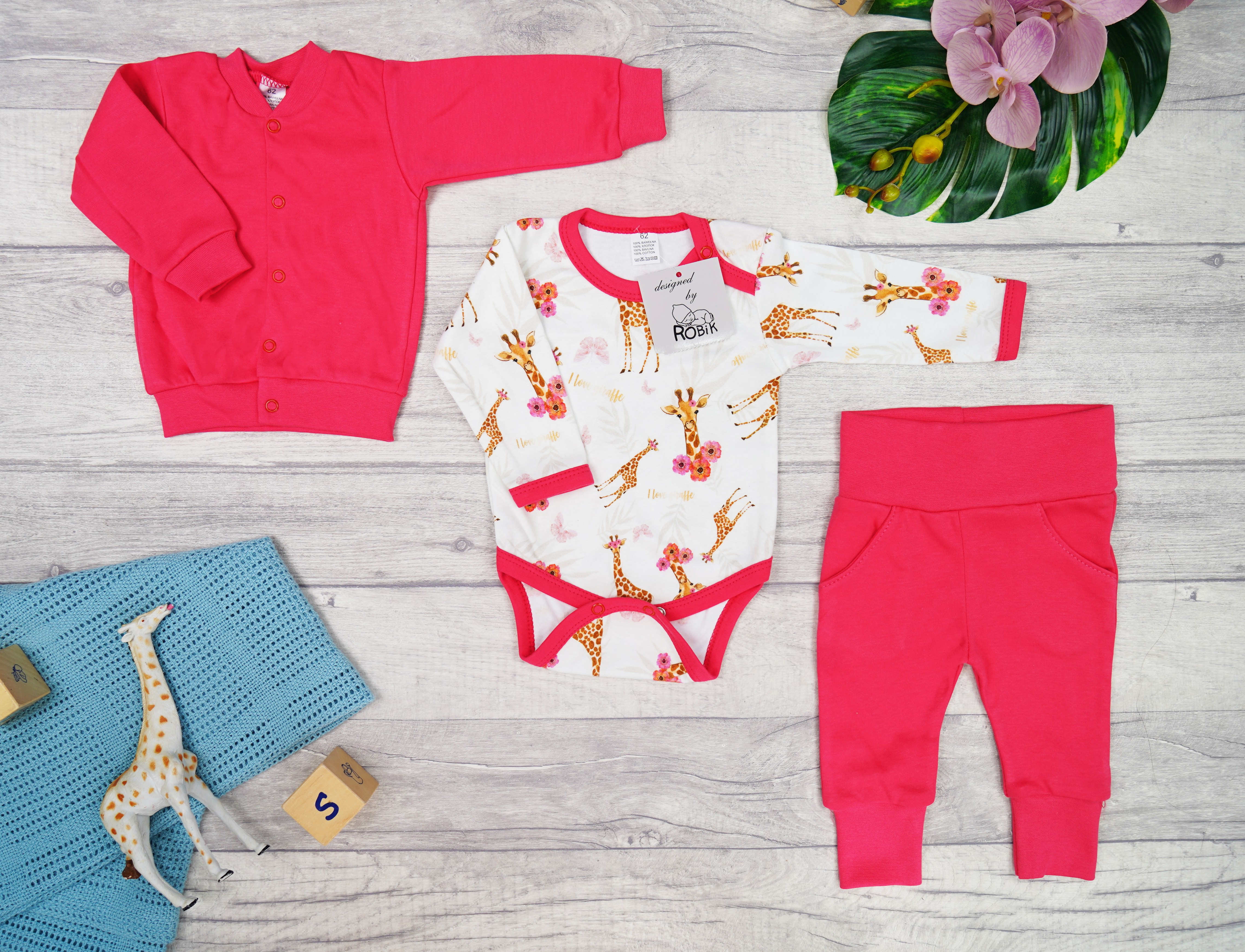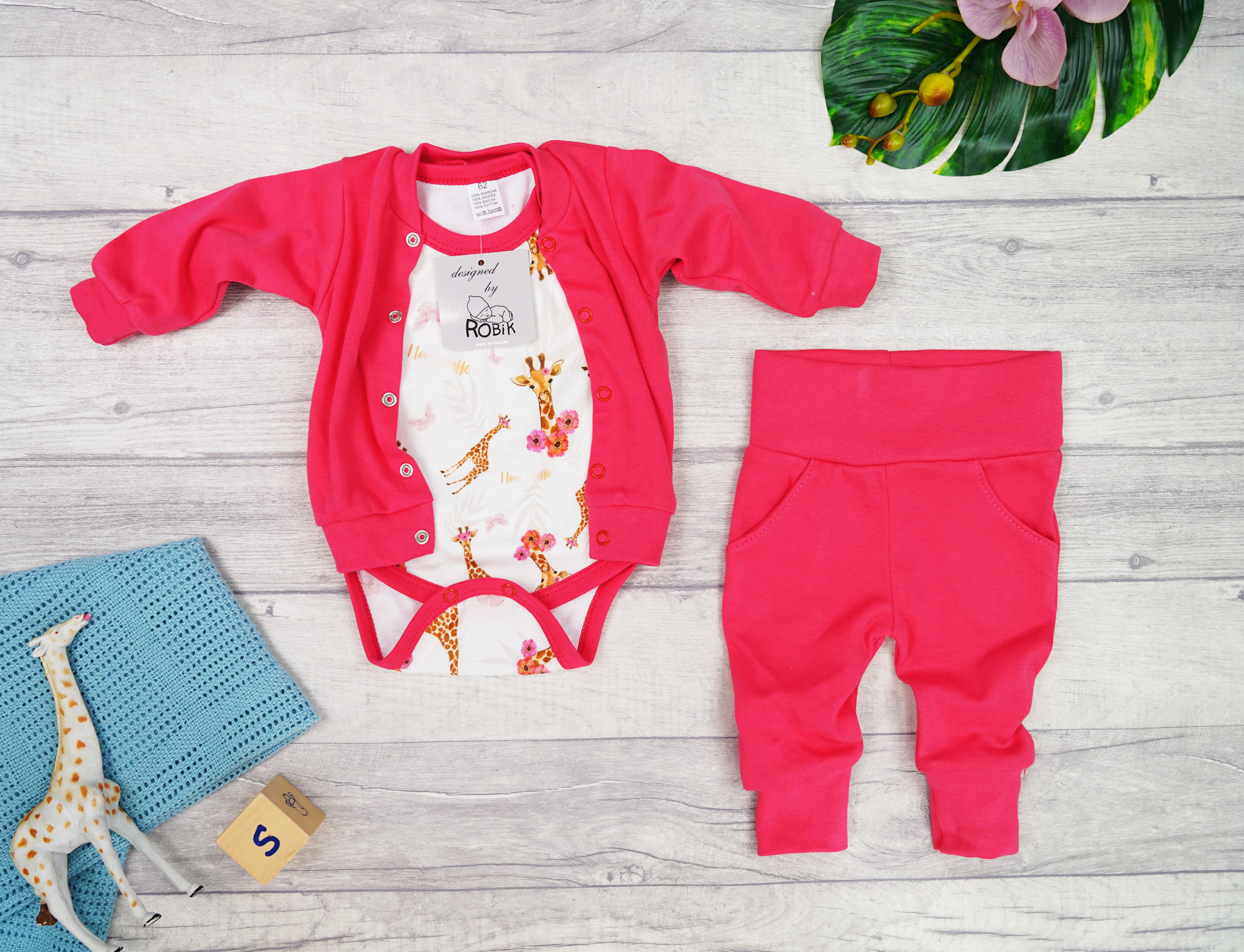 Malinowy komplet dla niemowlaka w żyrafy 3-częściowy - body, spodnie z kieszeniami i bomberka.